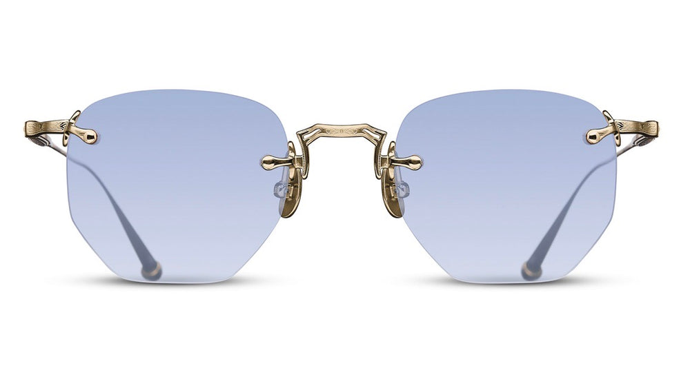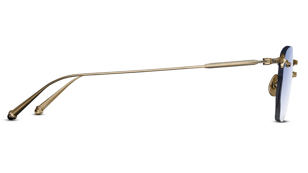 Elegant rimless geometric sunglasses with a distinctive vintage-inspired design. The frameless lenses are held by delicate gold-tone metalwork with sophisticated detailing at the attachment points. The light blue gradient lenses create a soft, ethereal look while maintaining clarity. The design features minimalist nose pads and slender temple arms with subtle decorative elements, embodying both luxury and restraint in its construction. The glasses showcase exceptional craftsmanship with their precise metalwork and balanced proportions.