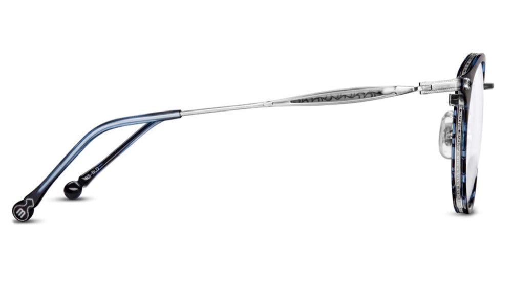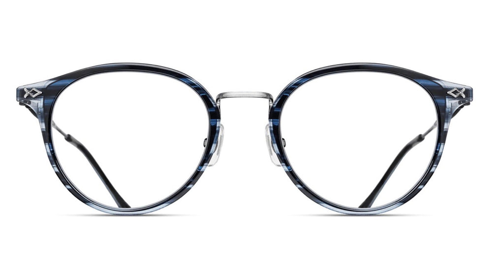 These elegant round eyeglasses feature a sophisticated blue-striped acetate rim combined with silver metal accents. The frame showcases a delicate blend of vintage and modern design elements with its thin profile and subtle striped pattern that transitions from dark blue to lighter tones. The nose bridge and temple arms are crafted from polished metal, creating a refined contrast with the acetate portions. The overall design presents a balanced mix of materials and colors that would suit both casual and formal settings.