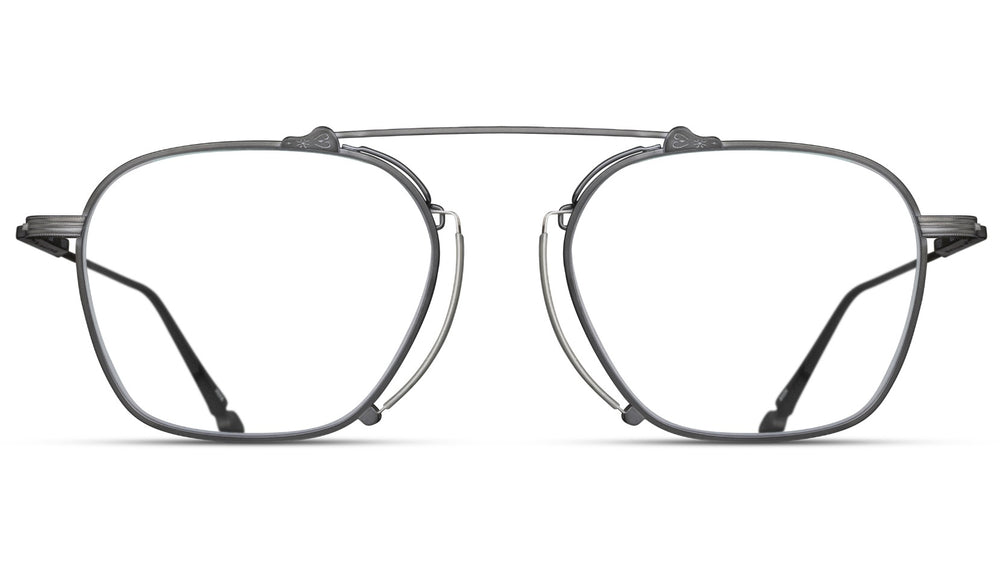 Classic double-bridge aviator-inspired optical frames with a refined geometric silhouette. The design features delicate metal construction with elegant wire rims and sophisticated architectural details. The brushed silver finish gives it a sophisticated, timeless appeal. The frame incorporates adjustable nose pads for comfort and precise fit, while maintaining a sleek, minimalist aesthetic that bridges vintage and contemporary styling.