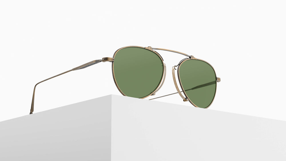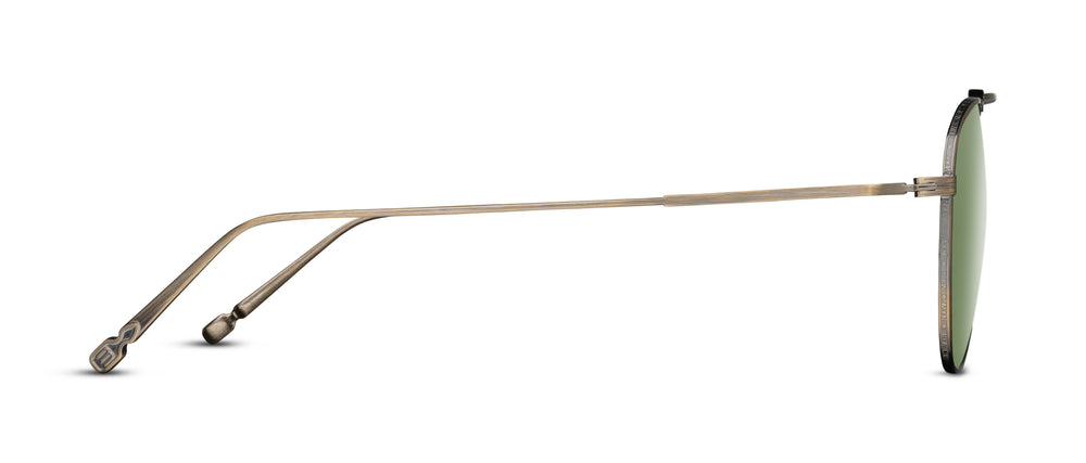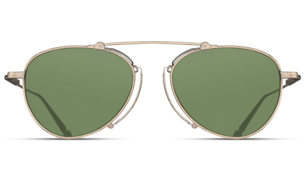Elegant vintage-inspired aviator sunglasses featuring a sophisticated double bridge design with delicate gold metal framework. The frames showcase a timeless silhouette with green-tinted lenses and subtle architectural details that demonstrate premium craftsmanship. The design incorporates adjustable nose pads for comfort and thin temple arms that complement the overall refined aesthetic. These glasses blend classic aviator styling with modern luxury details.