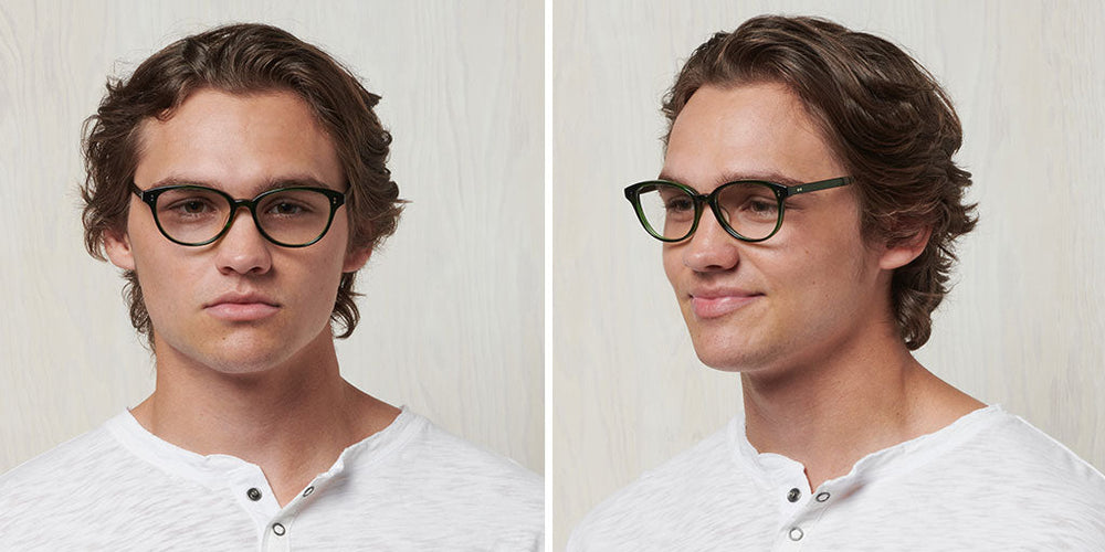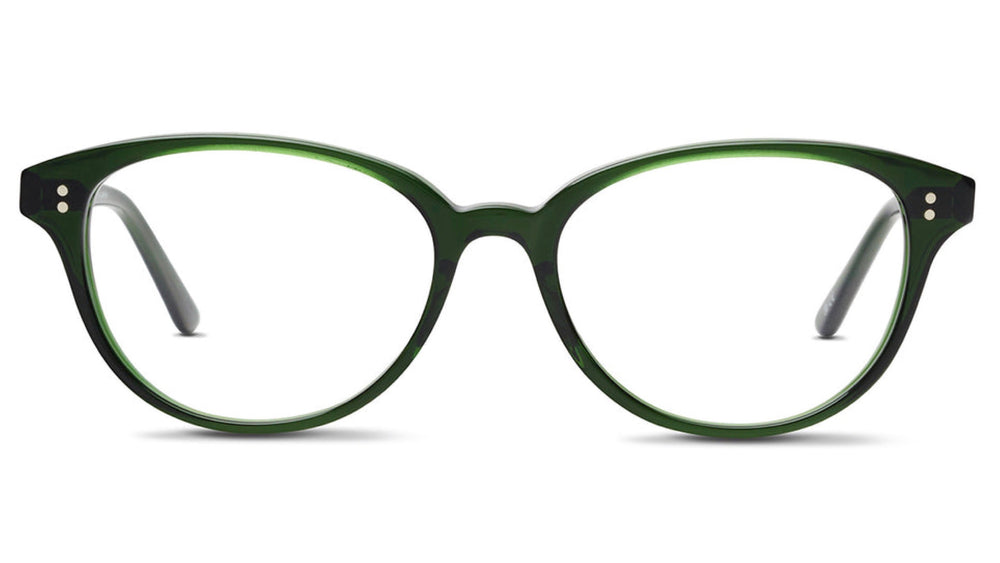 These elegant round-oval frames feature a translucent deep forest green color throughout. The design is classic and sophisticated with subtle detailing including small metallic dots on the temples. The frame has a balanced proportion with a medium thickness and traditional saddle bridge, making it suitable for everyday wear. The overall aesthetic is understated yet refined, with a slight vintage inspiration in its silhouette.