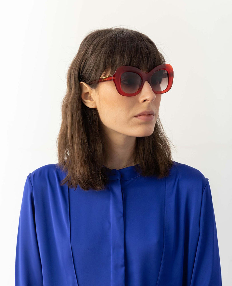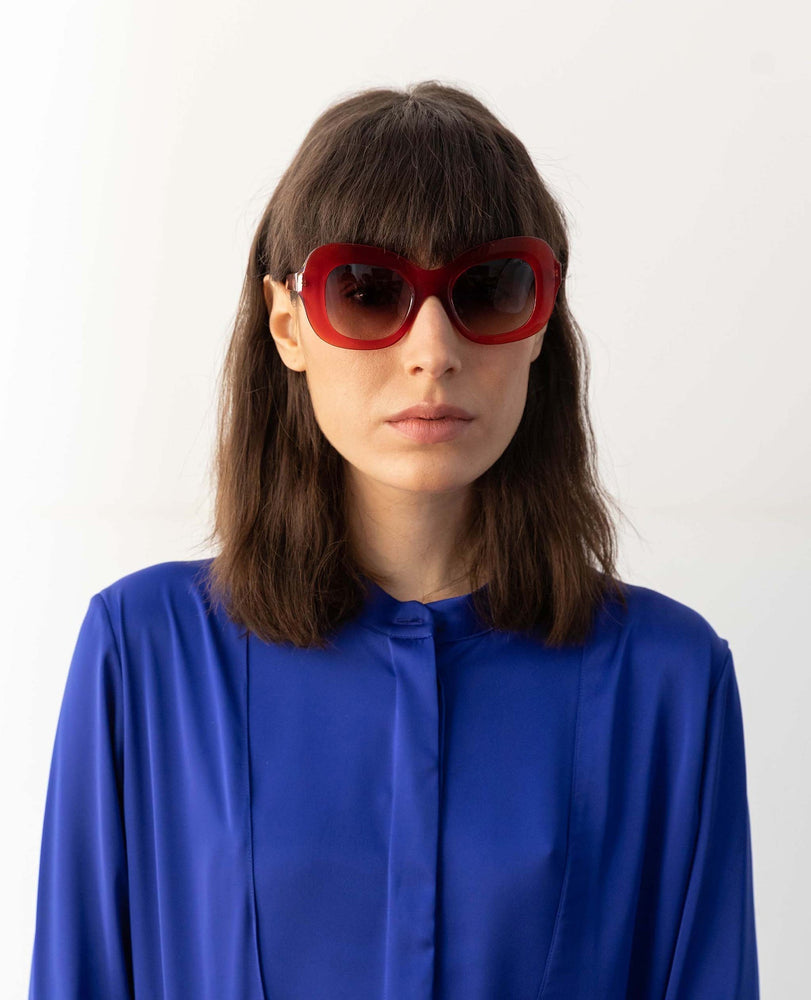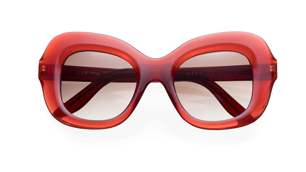 These oversized vintage-inspired sunglasses feature a bold red translucent acetate frame with a dramatic rounded butterfly silhouette. The thick frame construction tapers elegantly from temples to front, with gradient brown lenses and subtle branding on the temples. The design embodies retro glamour with a modern twist, perfect for making a sophisticated fashion statement.