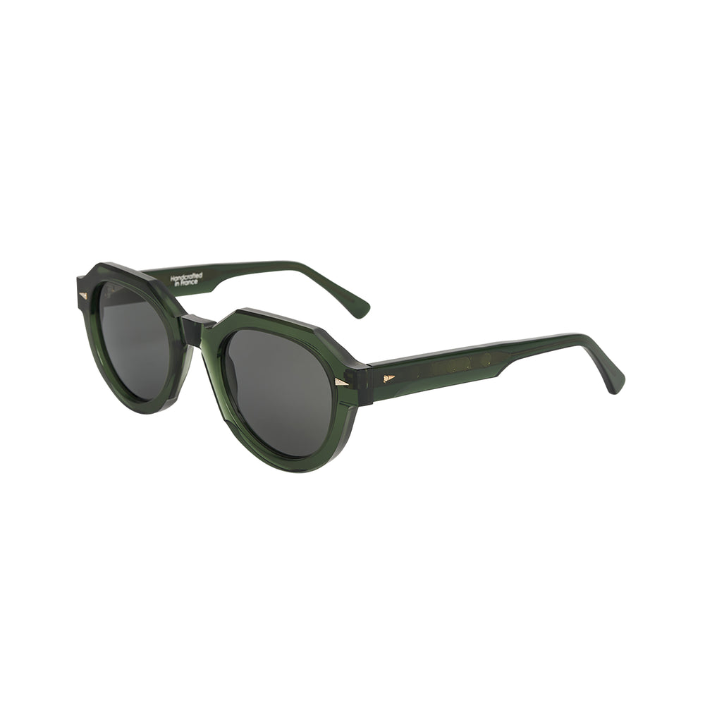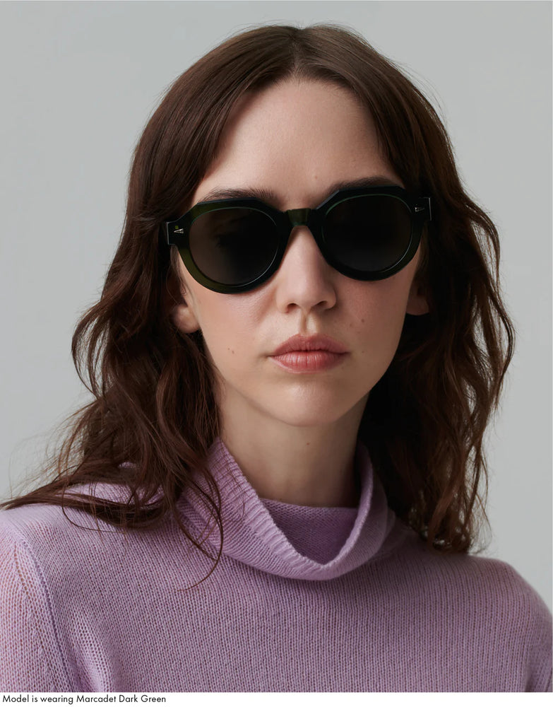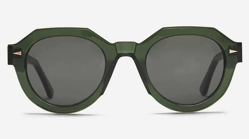 A sophisticated round-framed sunglasses in a translucent olive green colorway. The design features a bold, architectural silhouette with subtle metal accents at the temples. The frame has a modern, minimalist aesthetic with clean lines and a substantial build quality. The dark grey lenses complement the green frame perfectly, creating a harmonious and contemporary look suitable for both casual and formal wear.