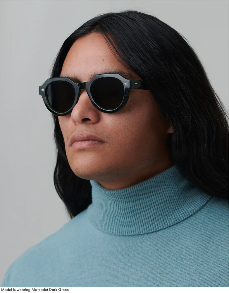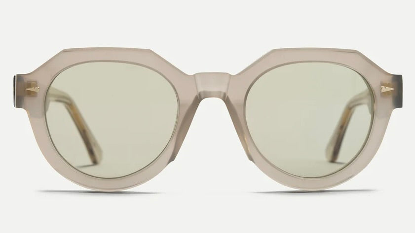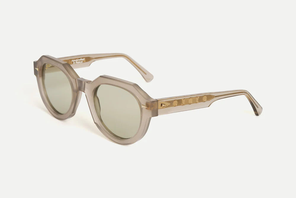 These contemporary sunglasses feature a sophisticated translucent grey acetate frame with a rounded silhouette. The design incorporates subtle gold-tone metal accents at the temples, creating an elegant contrast. The lenses have a light green tint and the frame has a modern, minimalist aesthetic with clean lines and a comfortable saddle bridge. The overall design strikes a perfect balance between vintage inspiration and contemporary styling.