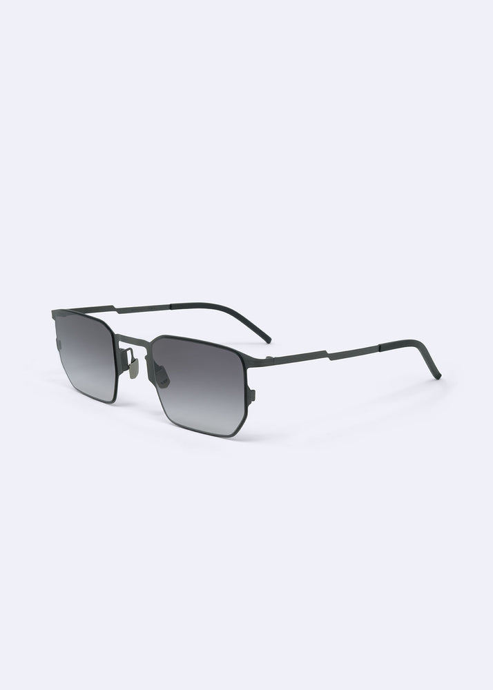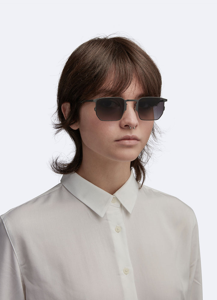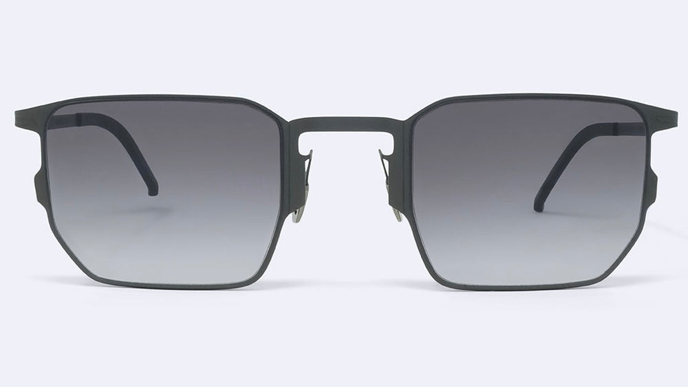 A sleek and contemporary geometric-shaped pair of sunglasses featuring a minimalist metal construction in a dark grey finish. The frames have a distinctive angular silhouette with clean lines and a modern aesthetic. The gradient grey lenses complement the frames understated design. The thin metal construction gives these sunglasses a lightweight and sophisticated appearance, perfect for urban style.