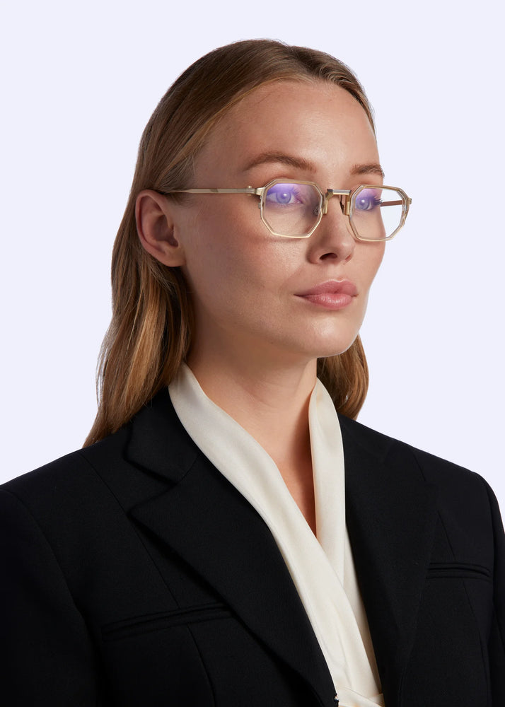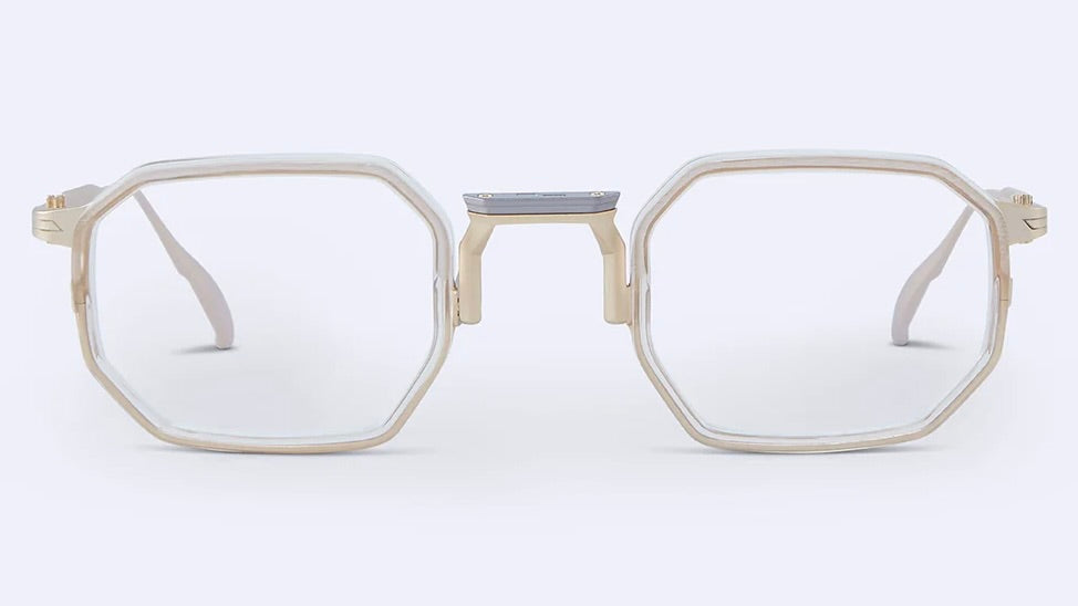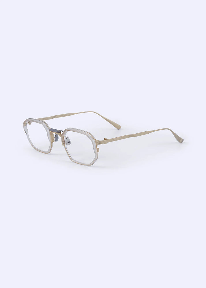 Distinctive octagonal-shaped frames with a sleek metallic champagne gold finish. The design features a minimalist yet sophisticated aesthetic with clean lines and geometric angles. The frames have a delicate, architectural quality with subtle detailing at the temple hinges. The nose bridge has a refined profile that complements the angular frame shape. These glasses project an air of modern luxury while maintaining a versatile, professional appearance suitable for any occasion.