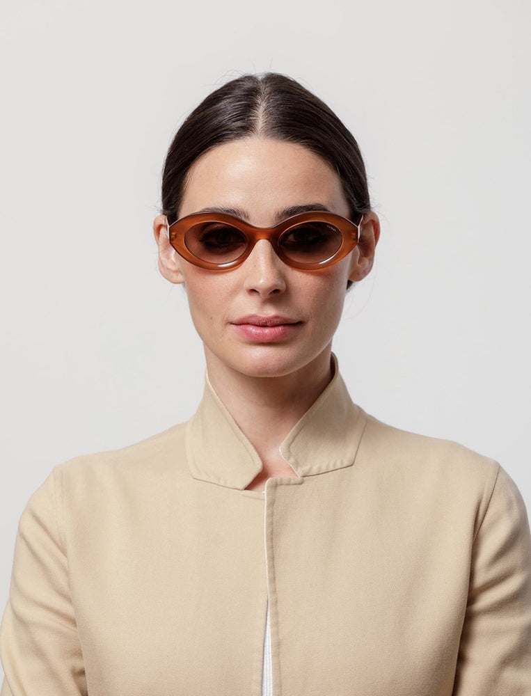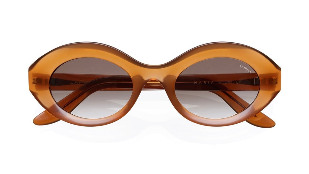 These vintage-inspired oval sunglasses by LAPIMA feature a bold transparent orange acetate frame with a distinctive curved silhouette. The chunky design includes gradient brown lenses and showcases smooth, flowing lines that create an elegant retro aesthetic. The frame has a uniform color throughout with slightly rounded edges that soften its substantial presence. The design achieves a perfect balance between statement-making boldness and sophisticated wearability.