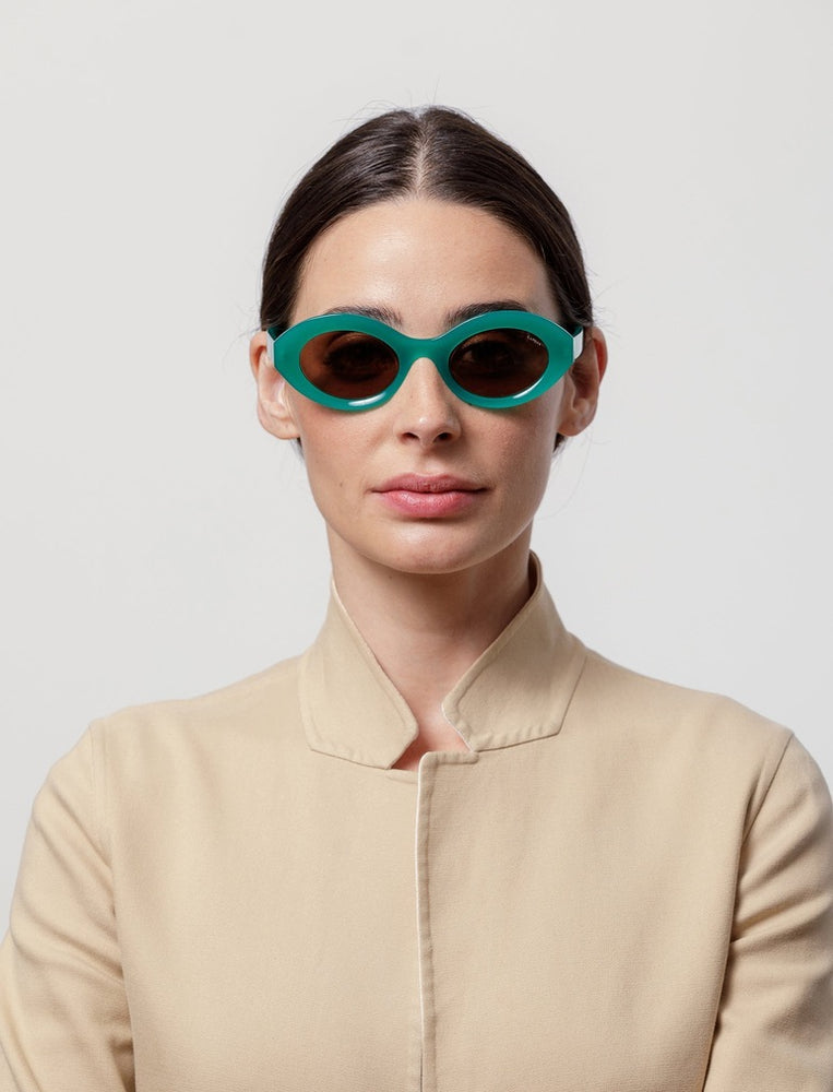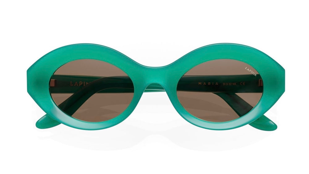 Striking translucent emerald green oval sunglasses with a bold, chunky retro-inspired frame. Features a seamless design with rounded edges and brown-tinted lenses. The LAPIMA MARIA model combines vintage aesthetics with modern styling, creating an eye-catching statement piece. The monochromatic green colorway extends from the thick frame through to the temple arms, with subtle branding visible on the temples.