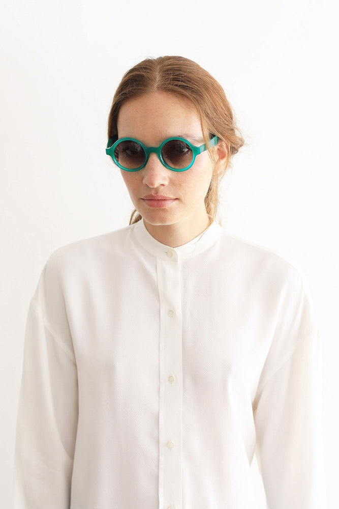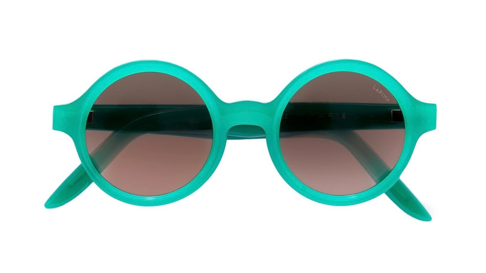 The MARIE sunglasses feature a striking turquoise-green circular frame with a retro-inspired silhouette. The chunky plastic construction creates a bold, statement look while maintaining a clean, minimalist design aesthetic. The gradient brown lenses are complemented perfectly by the vibrant frame color. These sunglasses offer a unique blend of vintage charm and contemporary style, with smooth curves and substantial temple arms that match the frame color. The design would particularly appeal to those seeking a distinctive, fashion-forward accessory that makes a colorful statement while remaining versatile enough for everyday wear.