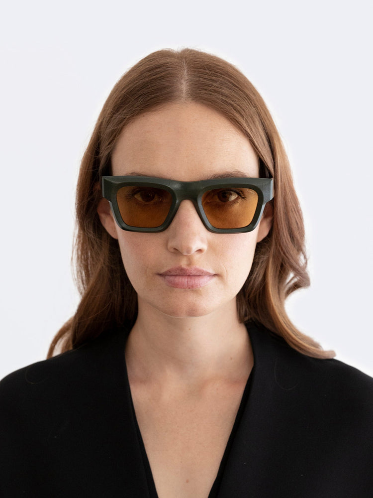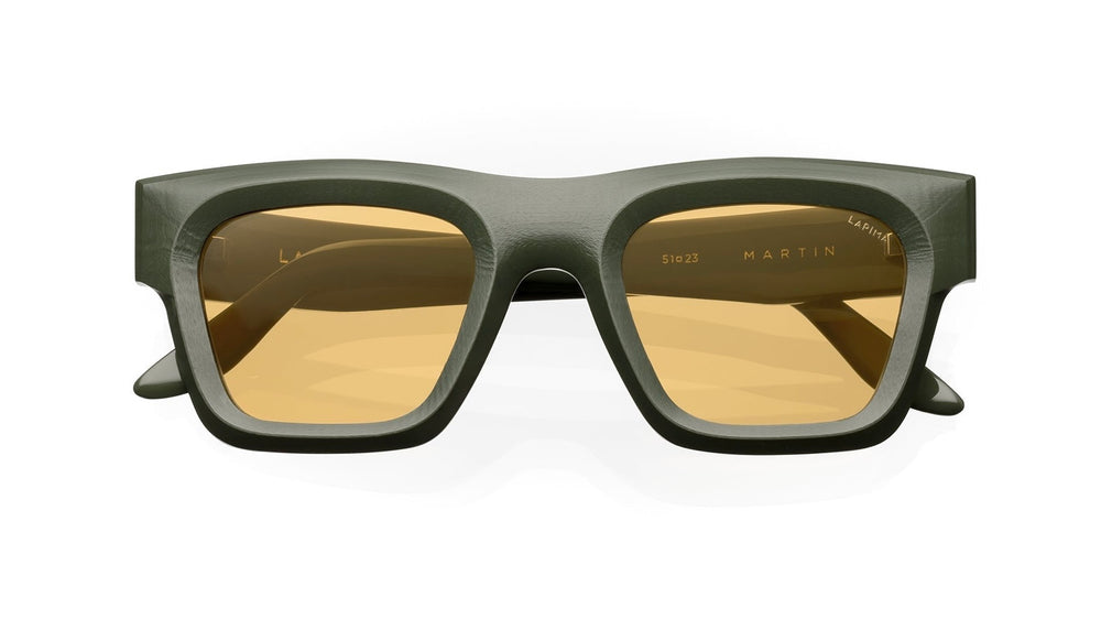 The MARTIN by LAPIMA features a bold, architectural design with a chunky square frame in a modern matte grey finish. The distinctive geometric silhouette is complemented by amber-tinted lenses that create a striking contrast. The chunky temples and substantial frame construction give these sunglasses a contemporary, fashion-forward aesthetic while maintaining a clean, minimalist approach. The saddle bridge provides comfortable fit, and the overall design suggests both luxury and durability in its execution.