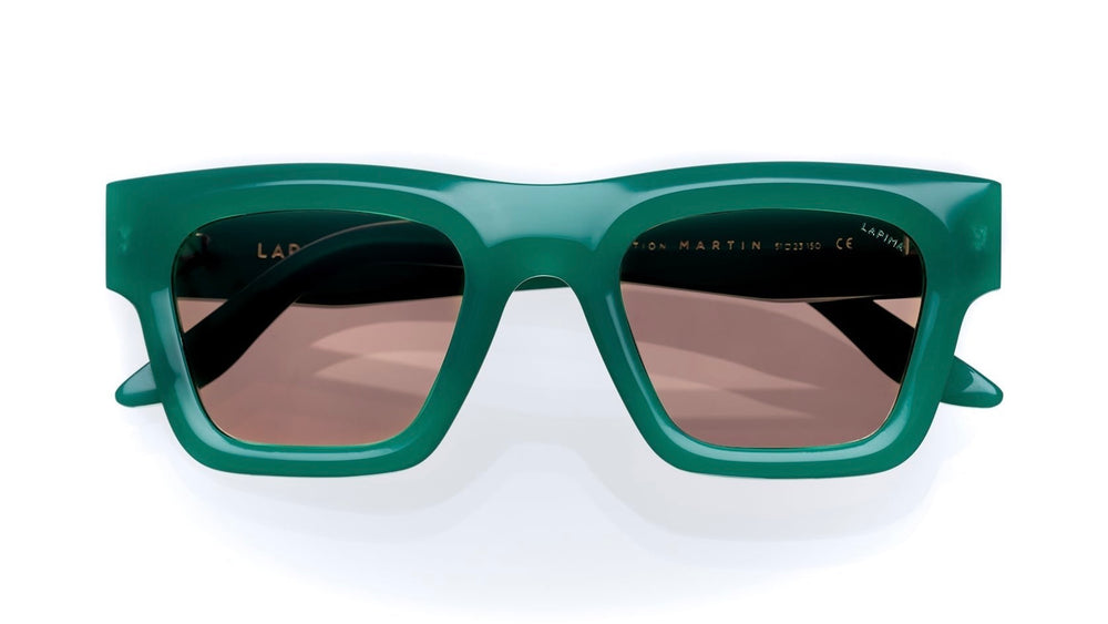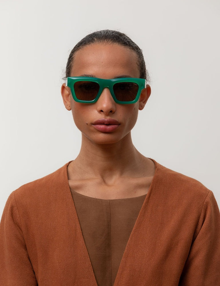 A bold, retro-inspired square sunglasses design featuring a chunky emerald green acetate frame. The glasses showcase a substantial, architectural silhouette with clean lines and sharp angles. The lenses are a warm brown tint, creating an elegant contrast with the frame. The temple arms maintain the same substantial width and green coloring as the front frame, creating a cohesive, luxury aesthetic. The design has a contemporary yet timeless appeal that would suit a variety of face shapes.