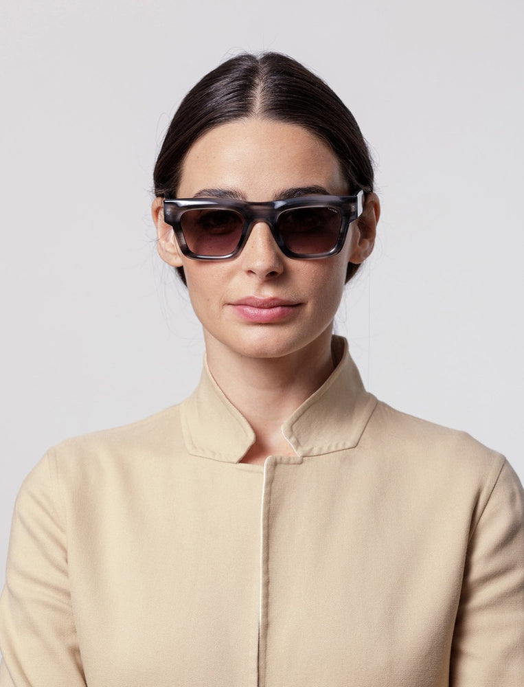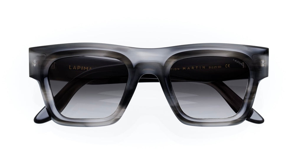 These LAPIMA MARTIN sunglasses feature a bold, architectural rectangular frame design in a sophisticated smoky grey gradient acetate. The chunky, statement-making silhouette has sharp angular lines and a substantial build quality. The frame graduates from a darker grey at the top to a slightly lighter grey tone at the bottom, creating an elegant ombré effect. The lenses are also gradient grey, complementing the frames color story. The design exhibits contemporary luxury with its clean lines and substantial proportions, making it a sophisticated choice for modern eyewear enthusiasts.