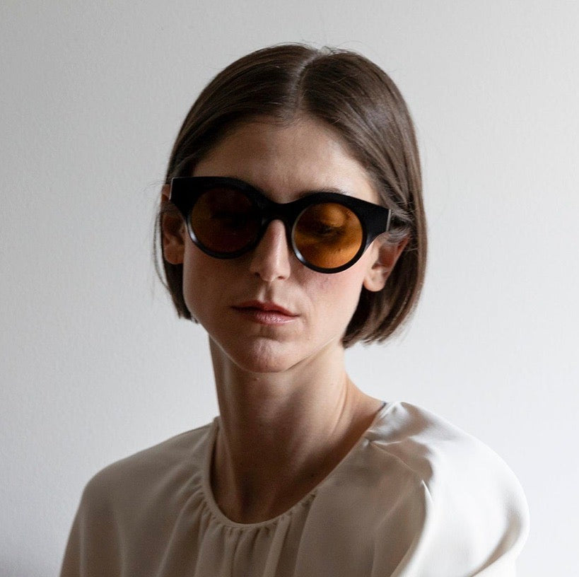 A bold, retro-inspired round frame sunglasses with thick black acetate construction and striking yellow-tinted lenses. The design features a prominent circular silhouette with a substantial frame thickness, creating a dramatic vintage aesthetic. The LAPIMA Matilde model showcases clean lines with a minimalist approach, offering a fashion-forward yet timeless appeal suitable for various face shapes. The chunky black frame provides a strong contrast against the yellow lenses, making it a standout accessory piece.