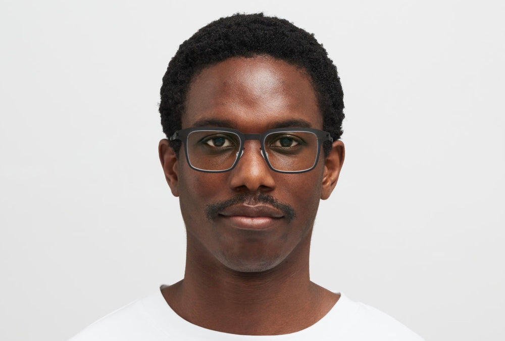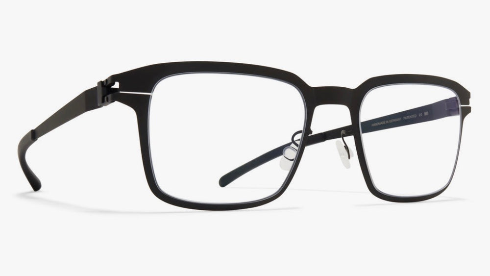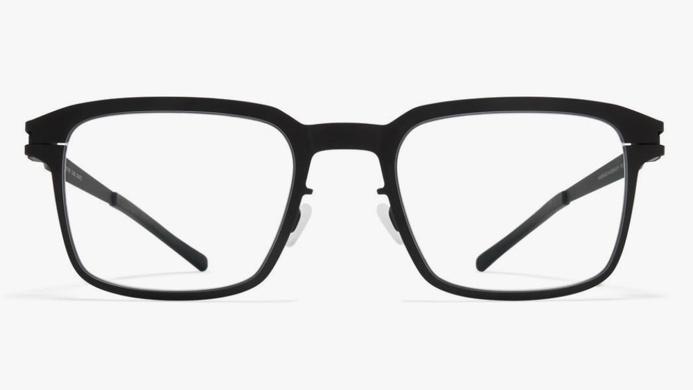 Modern minimalist square metal frames with a sleek matte black finish. Features clean architectural lines and a contemporary professional aesthetic. The frame has subtle angular corners and a well-balanced proportion that works well for both casual and formal settings. The nose bridge and temples demonstrate precise engineering with smooth joints and a sophisticated industrial design approach.