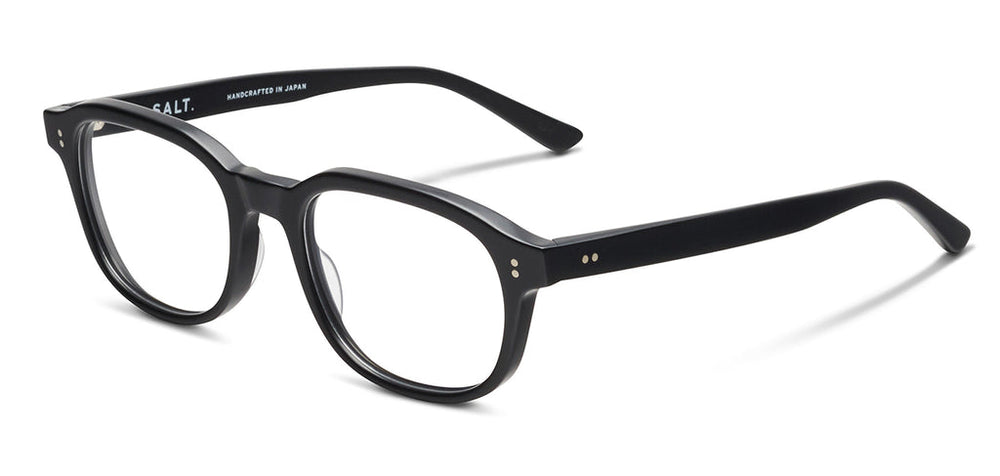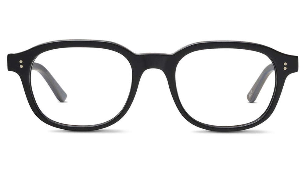 Classic rectangular wayfarer-style optical frames with a timeless design. Features subtle rivets on the front corners adding a sophisticated detail. The frame has a clean, professional look with a slightly rounded square shape and medium-weight construction. The matte black finish gives it a versatile, understated appearance suitable for both casual and formal settings.