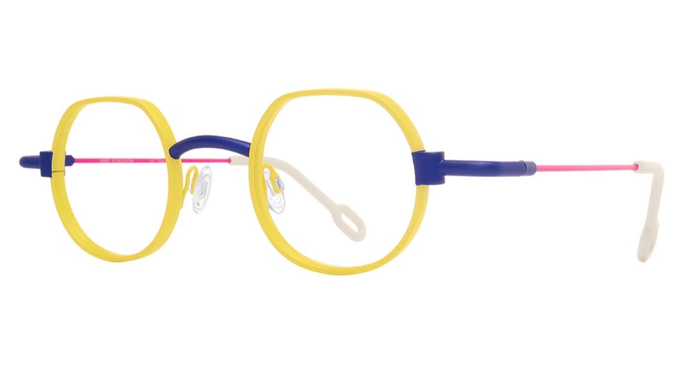 Unique colorful eyeglasses featuring a playful yellow metallic round frame with contrasting blue nose bridge and temple connections. The temples incorporate both blue and pink elements, creating a cheerful and artistic design perfect for young fashion-forward wearers. The thin profile and lightweight construction ensure comfort, while the nose pads provide adjustable fitting. The design strikes a beautiful balance between whimsical and sophisticated with its multi-colored components.