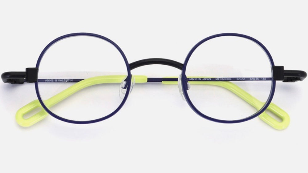 These are stylish round metal frames with a navy blue finish and contrasting neon yellow temple tips. The frames feature a minimalist design with thin rims and sleek nose pads. Made in Japan by Anne et Valentin, the MECACOOL model combines classic circular shape with modern two-tone colorway. The black bridge connects the rounded lenses while maintaining a lightweight, sophisticated appearance. The bright yellow temple tips add a playful pop of color to the otherwise understated design.
