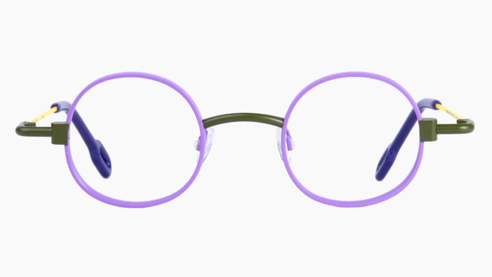 Fun and playful childrens eyeglasses featuring a thin round purple metal frame with olive green temple arms and bridge. The design incorporates unique mechanical-inspired details at the temple hinges with small yellow accents. The frames have a whimsical, retro-inspired aesthetic with modern touches, making them perfect for style-conscious kids. The circular lenses are housed in a delicate purple rim that provides both durability and lightweight comfort.