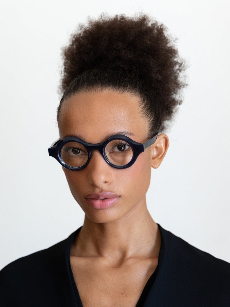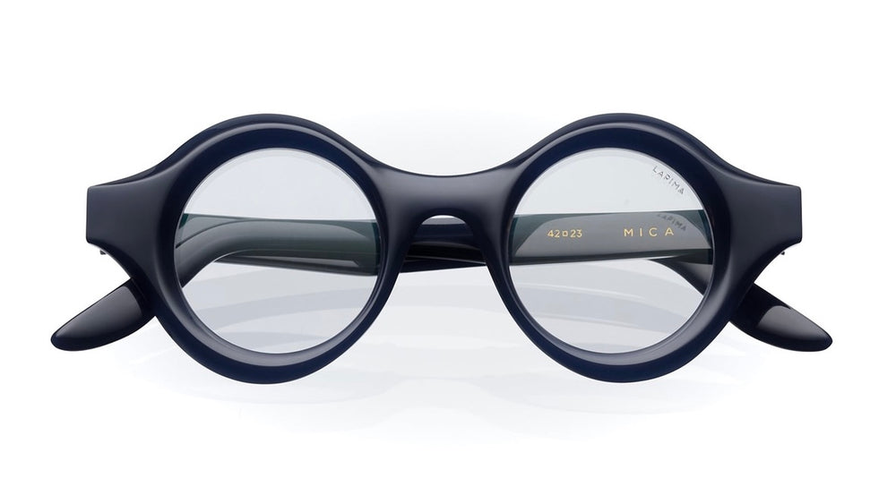 The MICA frames by LAPIMA feature a bold, statement-making round design with thick black acetate construction. The oversized circular lenses are housed in substantial rims that create a striking retro-intellectual aesthetic. The frame has a sophisticated matte black finish throughout, including the chunky temple arms that extend gracefully backward. The integrated saddle bridge adds to the frames solid, architectural appearance. These glasses exude a timeless quality while maintaining a contemporary edge, suitable for those seeking a distinctive, artistic eyewear choice. The substantial build quality and attention to detail are evident in the seamless construction and balanced proportions.