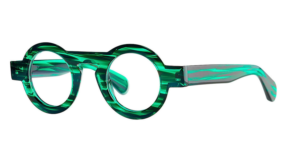 A striking pair of chunky, round eyeglasses featuring a bold, translucent emerald green acetate frame with a distinctive marbled/striped pattern throughout. The frames have an artistic, avant-garde aesthetic with substantial thickness and a bold presence. The design showcases clean lines with a prominent saddle bridge and thick temple arms that match the frames dramatic green coloring. The overall look is both sophisticated and statement-making, perfect for those seeking unique, high-fashion eyewear with architectural appeal.