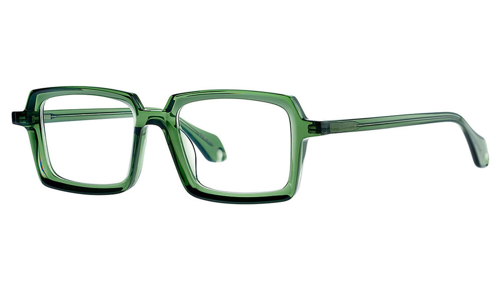 These striking translucent green eyeglasses feature a bold geometric shape with strong angular lines and a distinctive squared-off design. The frames have a contemporary architectural feel with clean lines and substantial thickness, making them a statement piece. The transparent green acetate material gives them a modern, artistic quality while maintaining visual lightness. The temple arms continue the same translucent green color scheme, creating a cohesive design that would appeal to those seeking unique, avant-garde eyewear.