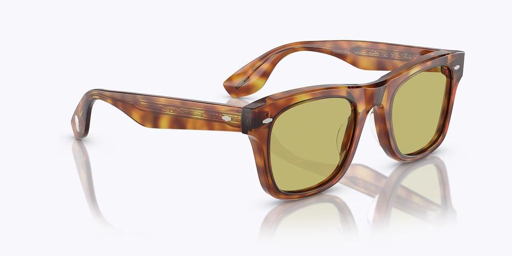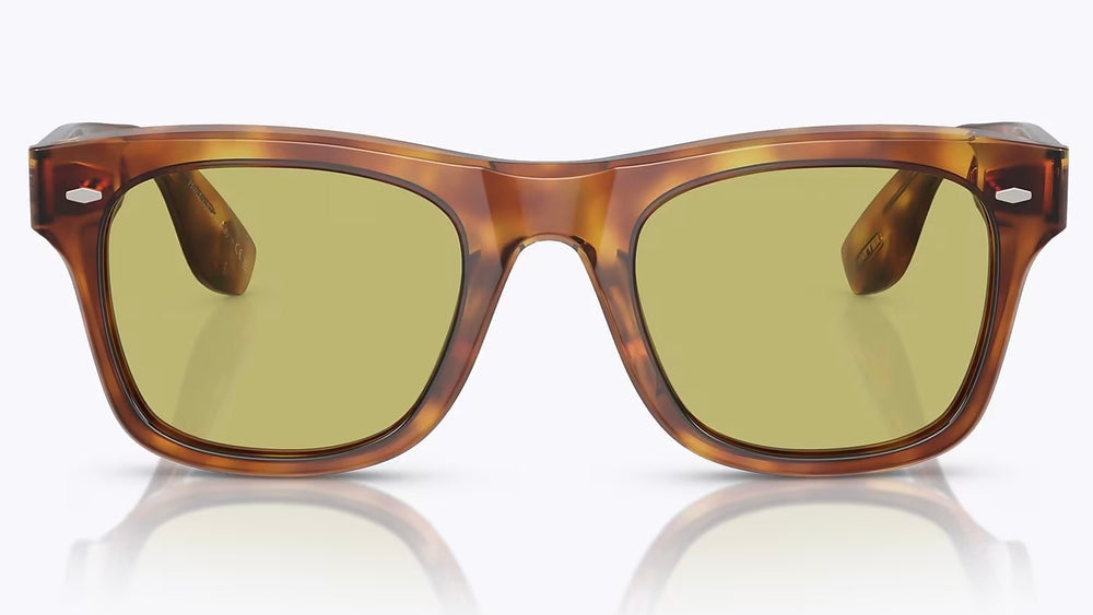 Classic wayfarer-style sunglasses featuring a luxurious tortoise acetate frame in rich honey-brown tones. The square silhouette is complemented by olive-tinted lenses creating a sophisticated, timeless look. The frame exhibits excellent build quality with substantial temple arms and clean architectural lines typical of Oliver Peoples design aesthetic.