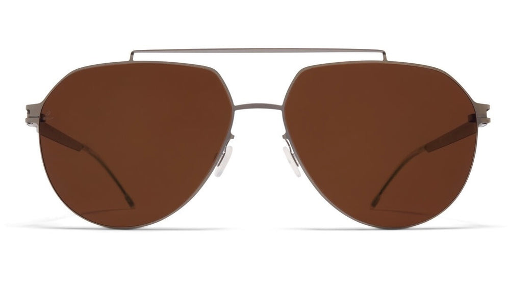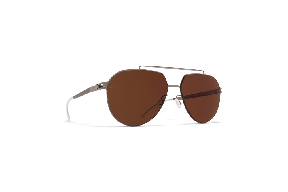 These sunglasses feature a classic aviator silhouette with a minimalist modern twist. The frame has a sleek brushed bronze metallic finish with ultra-thin temple arms and frame construction. The brown-tinted lenses are generously sized for optimal sun protection while maintaining a lightweight feel. The design emphasizes clean lines and premium materials, with adjustable nose pads for a customized fit. The overall aesthetic strikes a perfect balance between timeless style and contemporary sophistication.