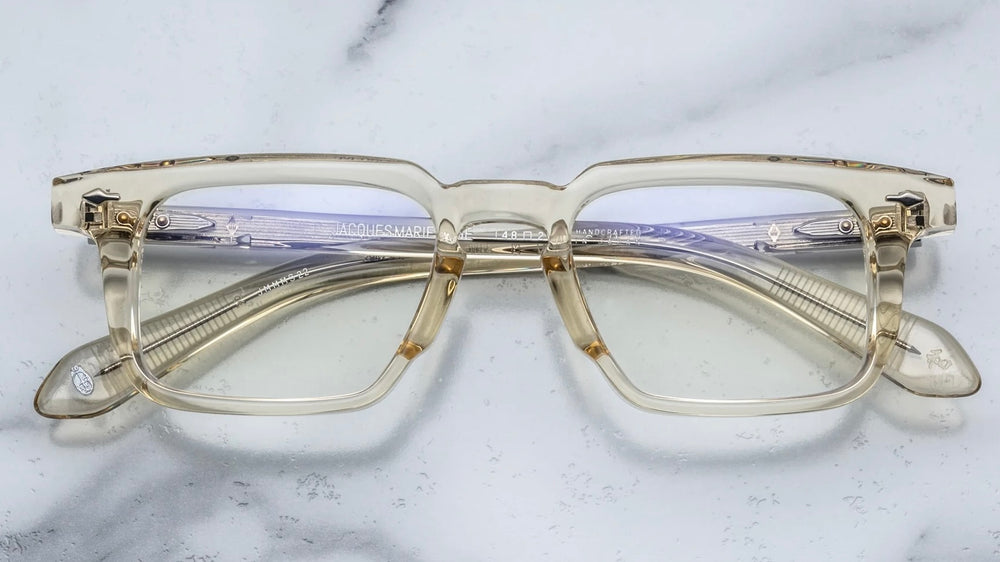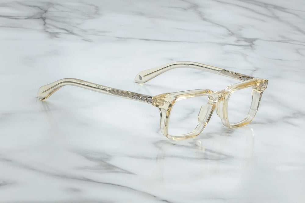 Sophisticated transparent crystal-colored acetate frames with a distinctive squared silhouette. The frames feature a bold, architectural design with clean lines and a transparent finish that gives them a modern, minimalist aesthetic. The crystal coloring adds an elegant, versatile touch that would complement any face shape or style. The frames appear to be well-crafted with attention to detail in the temple joints and overall construction.