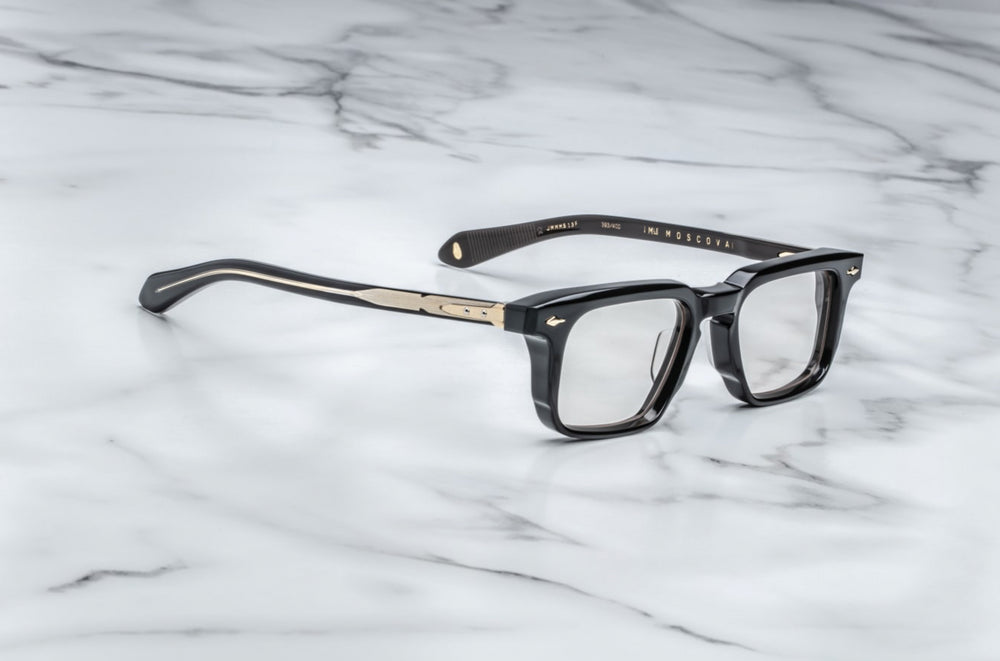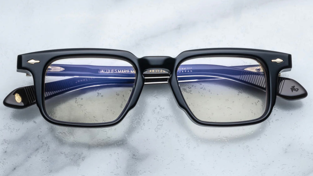 These are premium square-framed glasses by Jacques Marie Mage, featuring a bold, architectural design with a distinctive chunky acetate frame. The glasses showcase clean lines and a sophisticated retro-modern aesthetic with silver accents on the front corners. The substantial temple arms feature the brands signature design elements. The glasses appear to be crafted with high-quality materials and demonstrate exceptional attention to detail in their construction. The frame has a professional, intellectual appearance that would suit a variety of face shapes.