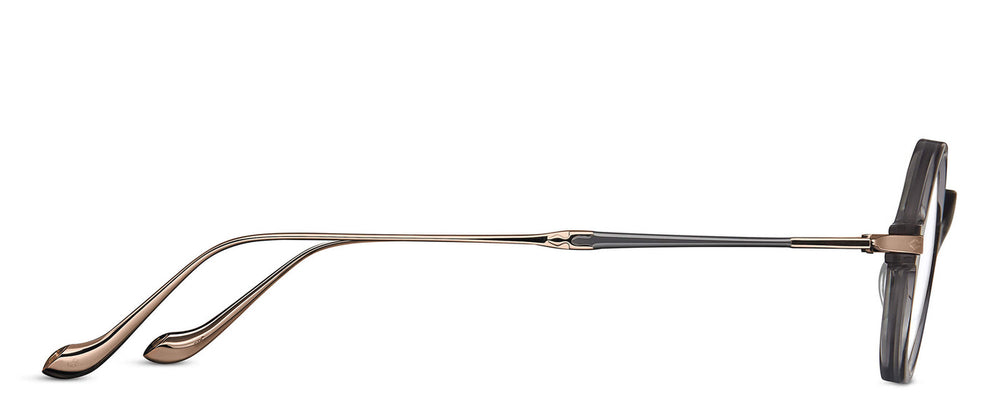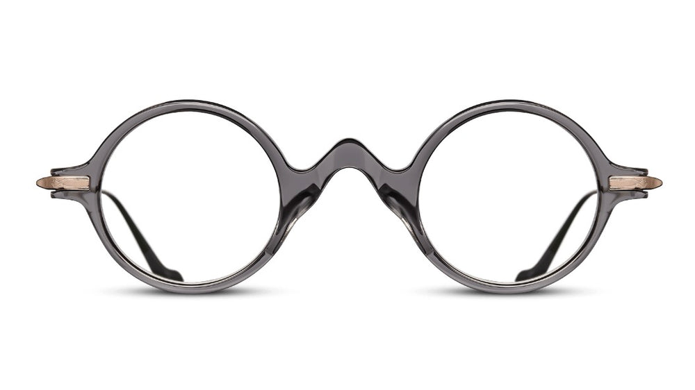 This is an elegant pair of round metal-framed glasses featuring a sophisticated gunmetal grey finish. The frames have a distinctly vintage-inspired design with delicate bronze-colored temple tips. The construction showcases fine craftsmanship with thin, graceful lines and minimal nose pads. The perfectly circular lenses and slender bridge create a balanced, timeless aesthetic that would appeal to those seeking a refined, intellectual look. The overall design suggests Japanese-influenced precision engineering and attention to detail.