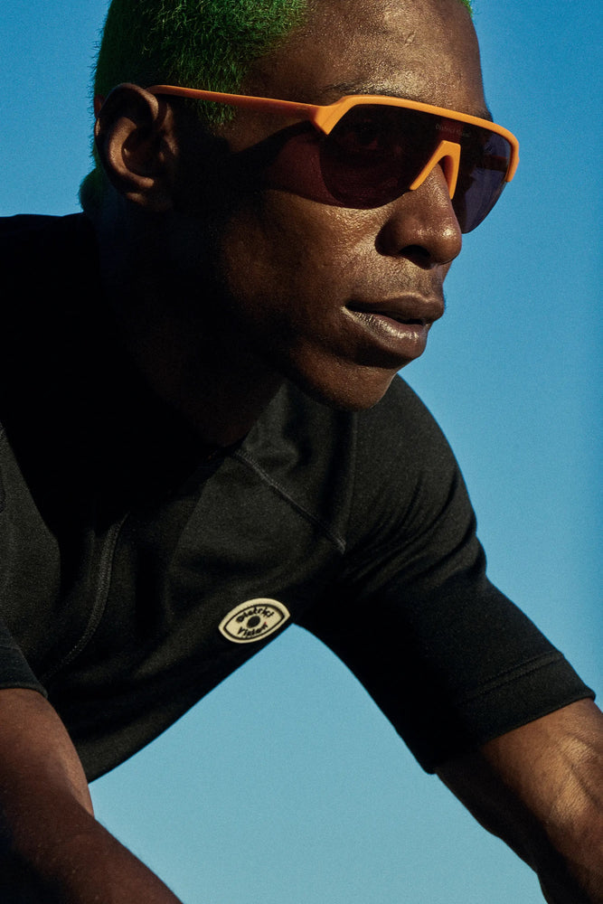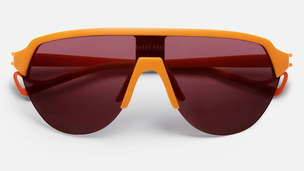 Modern, sleek sports sunglasses with a shield-like single lens design. The frame features a bold orange colorway with a wraparound style typical of performance eyewear. The sunglasses have a minimalist, aerodynamic silhouette with integrated nose bridge and slim temples, designed for athletic activities. The dark brown lenses provide excellent coverage and sun protection while maintaining a stylish aesthetic. The design emphasizes both functionality and contemporary fashion, suitable for both active sports and casual wear.