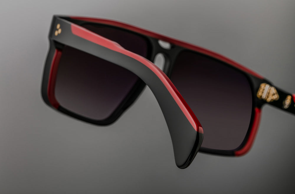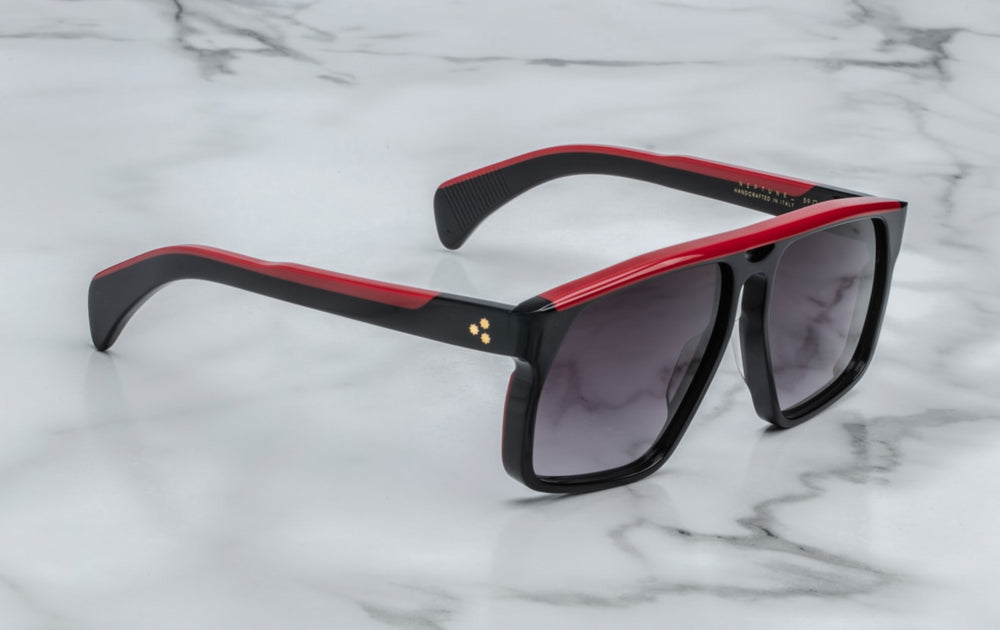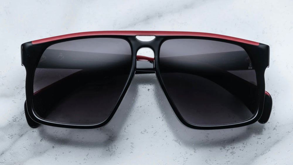 Contemporary chunky square sunglasses with a bold flat-top design. Features a glossy black frame with striking red accents on the temple arms. The oversized geometric silhouette creates a strong, masculine aesthetic with clean angular lines. The saddle bridge and substantial frame thickness give it a premium, luxury appearance. The dark lenses and modern colorway make it suitable for everyday wear while maintaining a fashion-forward edge.