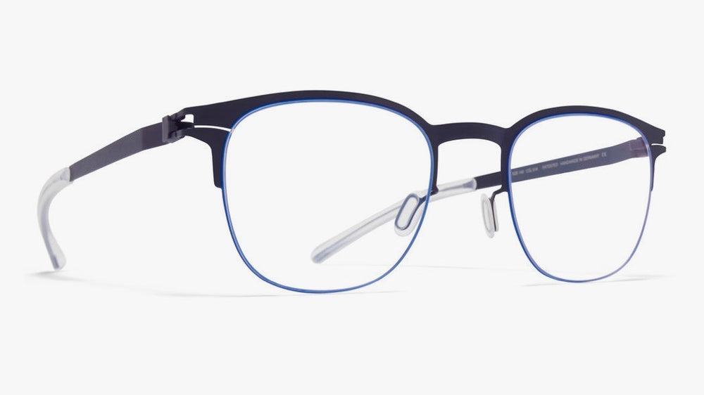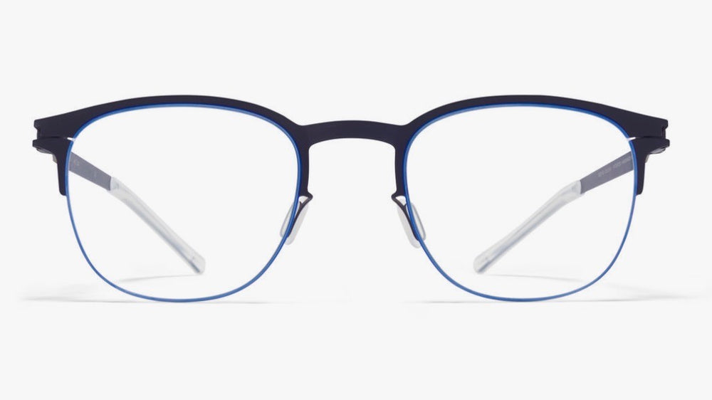 A sleek and modern oval-shaped eyeglass frame featuring a sophisticated two-tone design with navy blue front rim and light grey temple arms. The frame showcases a minimalist construction with clean lines and a contemporary aesthetic. The thin metal construction provides a lightweight feel while maintaining structural integrity. The design incorporates subtle details like slim nose pads and refined temple arms, making it suitable for both professional and casual settings.