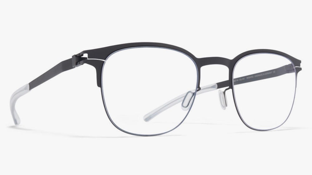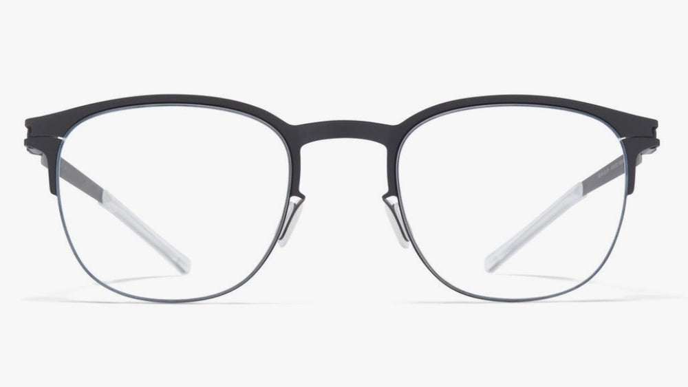 A sleek and modern geometric frame with a minimalist design that embodies contemporary sophistication. The matte black metal construction features clean lines and a lightweight profile. The frame has a distinctive browline with subtle architectural details at the temples. The nose pads and temple arms are perfectly integrated into the overall design, creating a seamless look.