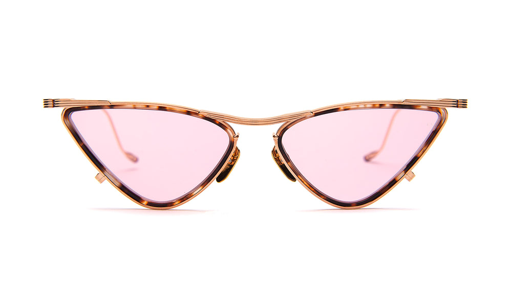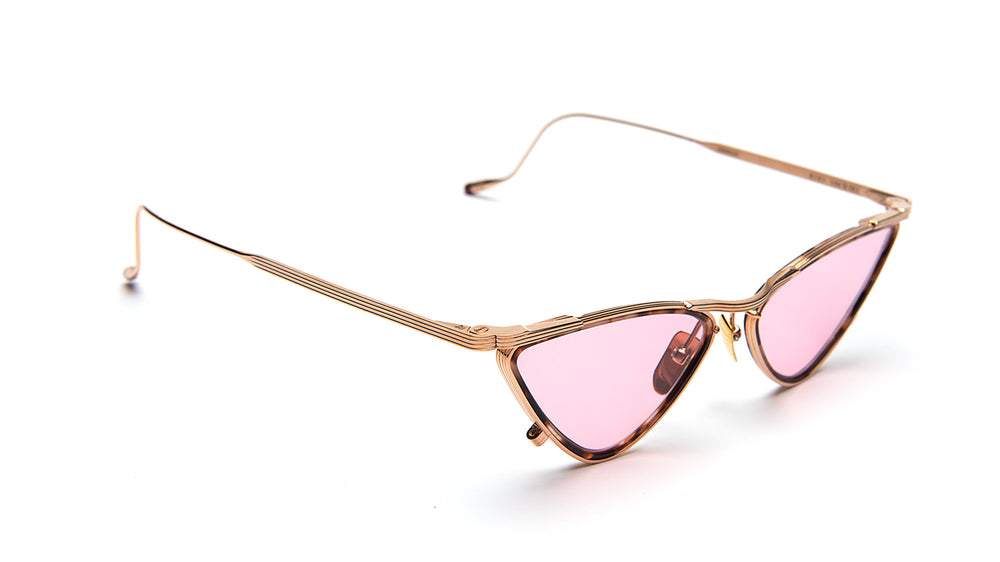 These are striking, premium cat-eye sunglasses with an elegant gold-toned metal frame and pink-tinted lenses. The design features a distinctive angular silhouette with upswept corners and decorative linear details on the temple arms. The frame has a refined, vintage-inspired aesthetic with delicate metalwork and a sophisticated tortoise accent along the top rim. The overall construction appears lightweight yet luxurious, embodying both retro glamour and contemporary style.