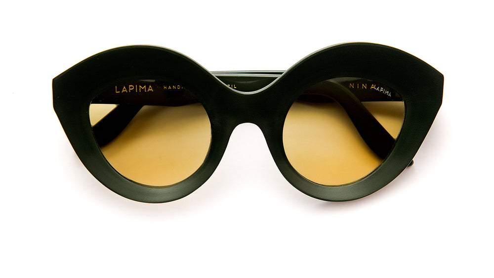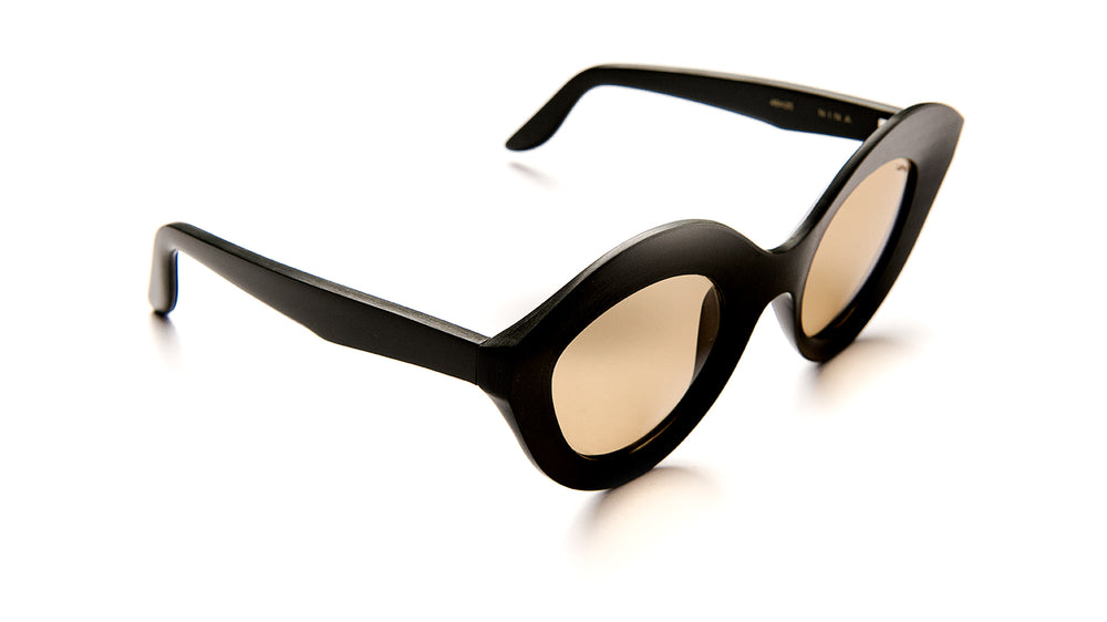 Bold, oversized cat-eye sunglasses by LAPIMA featuring a chunky matte black plastic frame with dramatic upswept angles. The amber-tinted lenses provide a vintage-inspired look while offering modern sun protection. The design showcases clean lines and minimalist aesthetics with subtle branding on the temples. The thick, architectural frame construction creates a striking silhouette that makes a strong fashion statement while maintaining wearability.