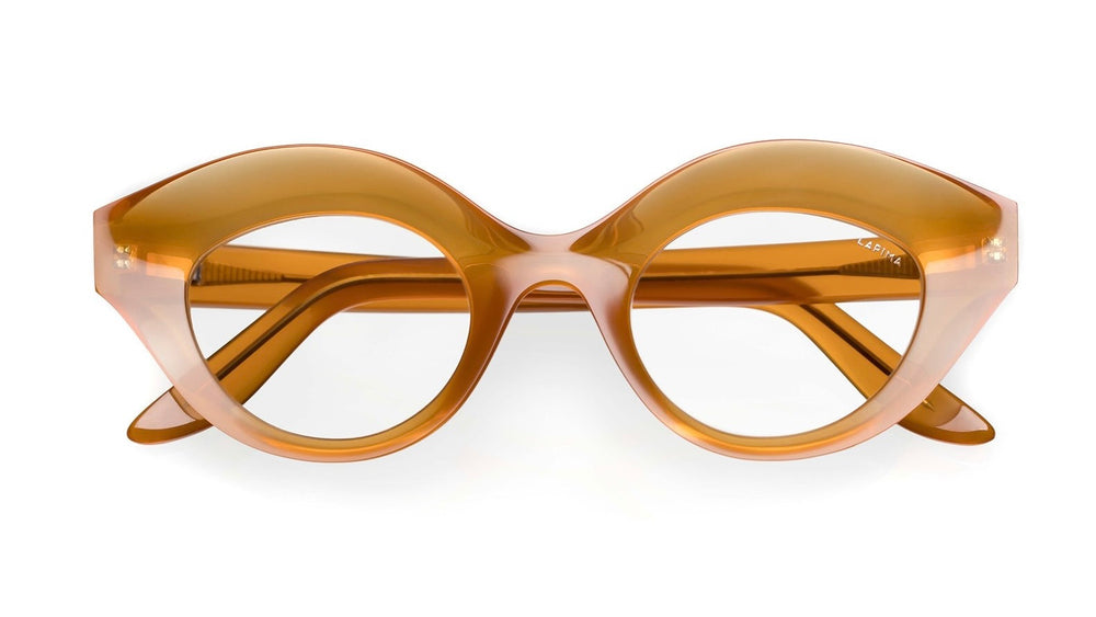 These are striking oversized oval frames in a warm amber/peach gradient color. The frames feature a bold, statement-making silhouette with thick rims that create a dramatic cat-eye effect. The translucent plastic material gives them a modern, sophisticated look. The design appears to be influenced by 1970s vintage eyewear but with a contemporary twist. The frames have smooth, curved lines and appear to be well-balanced with comfortable-looking temple arms that match the front frame color.