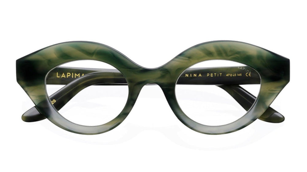 A luxurious oversized cat-eye frame in a distinctive marbled forest green to grey gradient acetate. The frame features a bold, dramatic silhouette with thick rims that taper from top to bottom. The vintage-inspired design shows sophisticated craftsmanship with its smooth transitions and high-quality finish. The eyewear has gold LAPIMA branding visible on the temple, adding a touch of elegance to this statement piece.