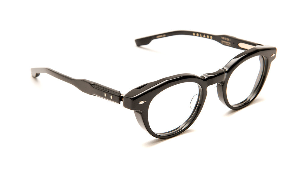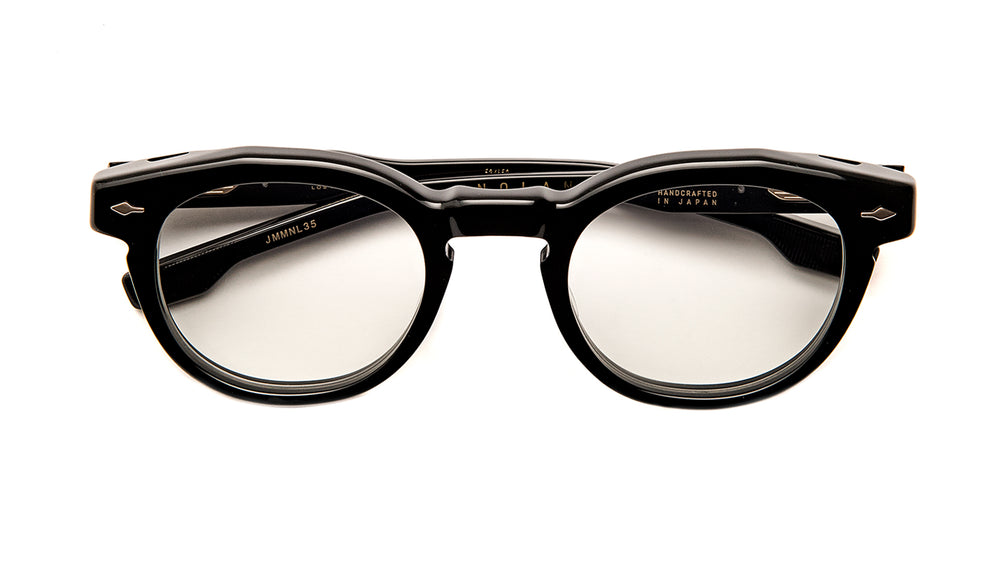 These are sophisticated Japanese handcrafted round eyeglasses with a bold, thick acetate frame construction. The glasses feature a distinctive retro-inspired design with a prominent keyhole bridge and curved temple arms. The frames have subtle decorative metal accents on the front and temples. The overall aesthetic is classic yet fashion-forward, with clean lines and excellent attention to detail. The substantial black frame makes a strong style statement while maintaining timeless appeal. The lenses are housed in perfectly circular eye rims that complement the vintage-inspired silhouette.