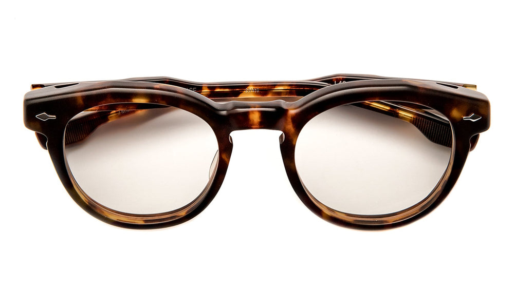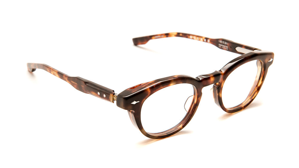 Classic round thick-rimmed eyeglasses with a bold tortoiseshell acetate frame featuring a prominent brow line and substantial temple arms. The glasses showcase a sophisticated vintage-inspired design with luxurious tortoise patterning that varies between dark and amber tones. The frame has a substantial build quality with clean architectural lines and subtle diamond-shaped accents on the front corners, demonstrating refined craftsmanship typical of high-end eyewear.