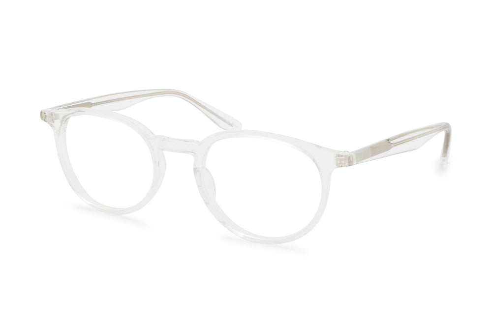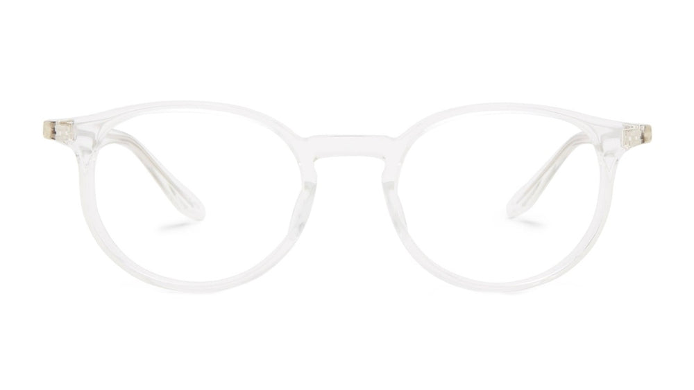 These elegant round eyeglasses feature a sophisticated transparent crystal-clear acetate frame construction. The design showcases a clean, minimalist aesthetic with a contemporary take on classic round frames. The translucent material creates a light, airy appearance while maintaining structural integrity. The temple arms smoothly integrate with the front frame, creating a seamless look. These glasses offer a refined, intellectual aesthetic that would complement both casual and formal attire.