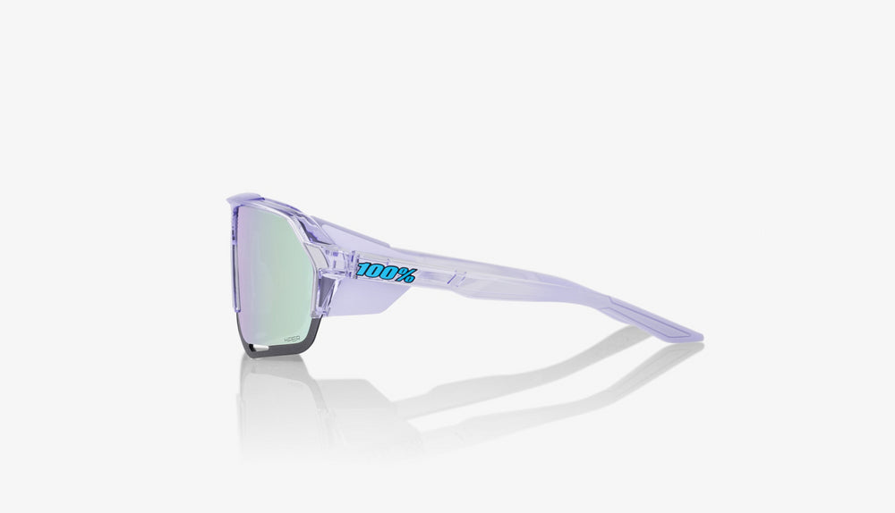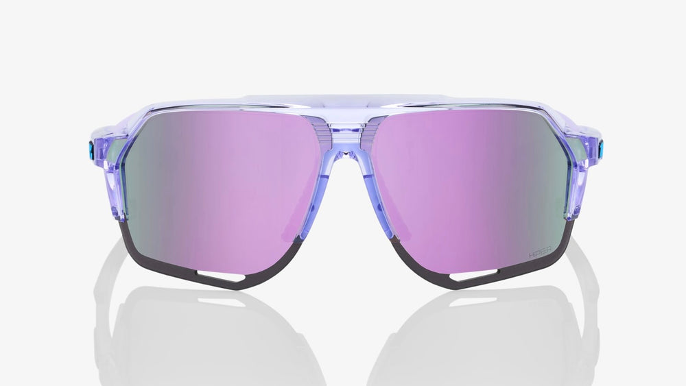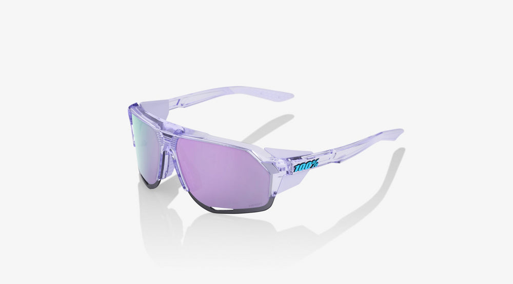 These striking sport sunglasses feature a bold geometric design with a transparent purple frame that transitions to black at the bottom. The lenses are mirrored with a stunning violet-pink iridescent finish that creates an eye-catching holographic effect. The frames have a modern, angular silhouette with protective side shields and a sporty, wraparound style typical of performance eyewear. The design incorporates both style and functionality, with a durable construction that appears suited for active outdoor use. The transparent purple frame material adds a unique contemporary aesthetic while maintaining a substantial, protective build quality.