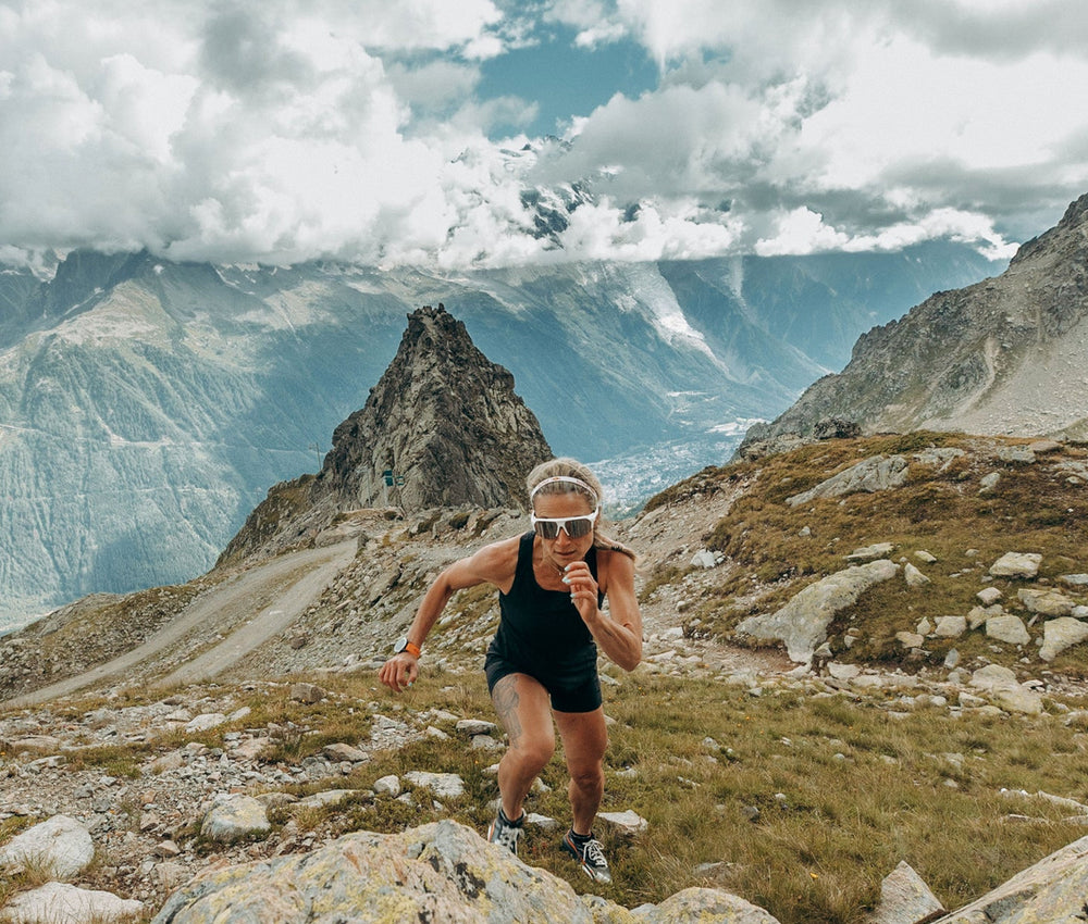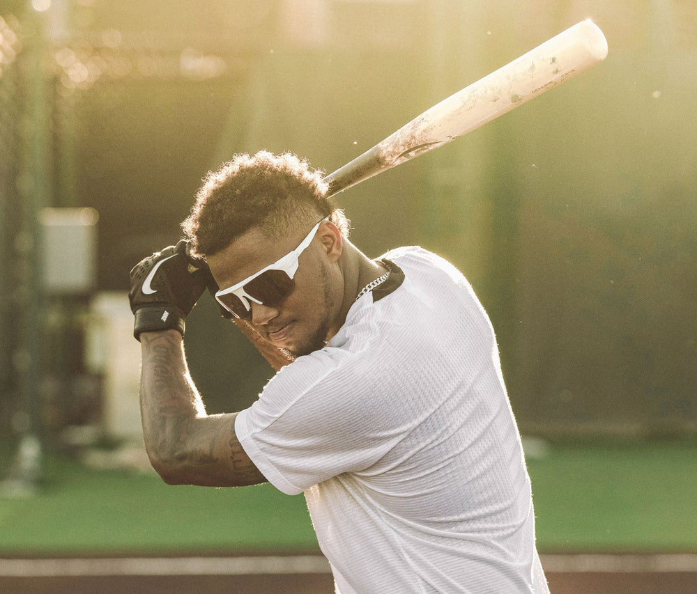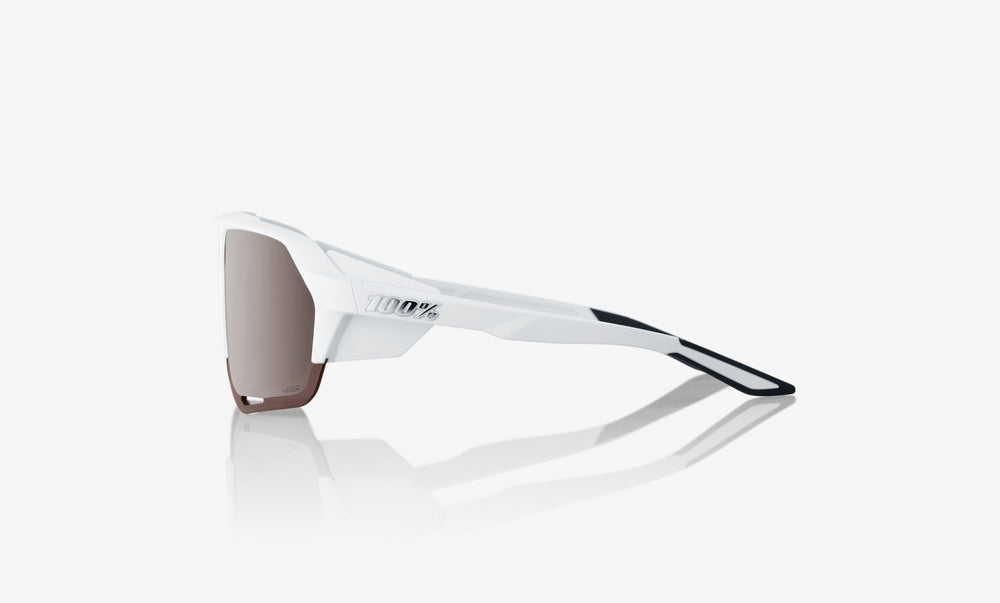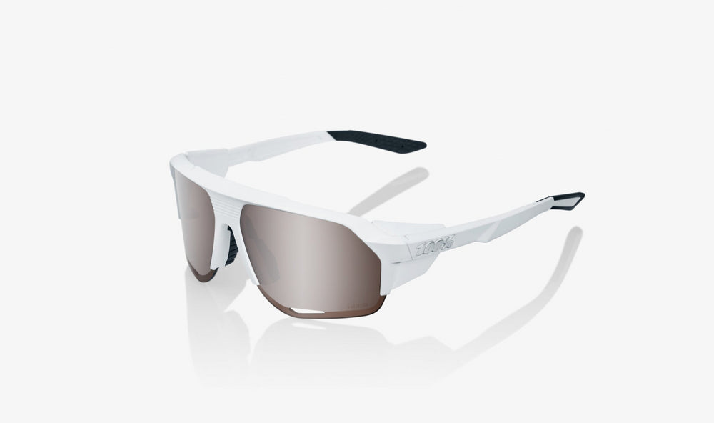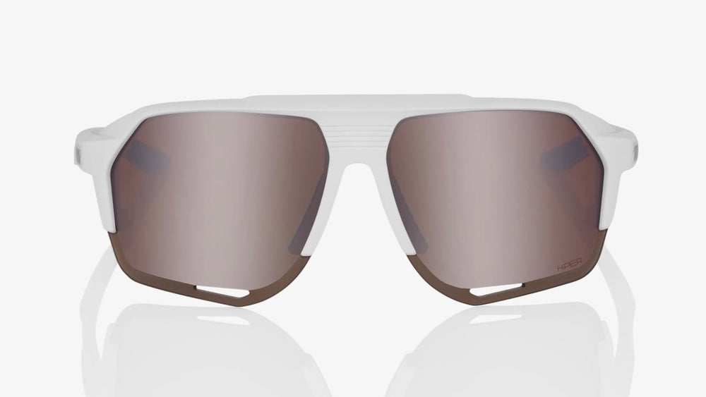A modern athletic-inspired sunglasses design featuring a bold white upper frame with a distinctive brown lower accent. The sporty silhouette has angular geometric lines and a contemporary floating lens design. The frame has a textured matte finish with subtle horizontal striping details on the upper portion. The wraparound temple design suggests enhanced stability for active wear.
