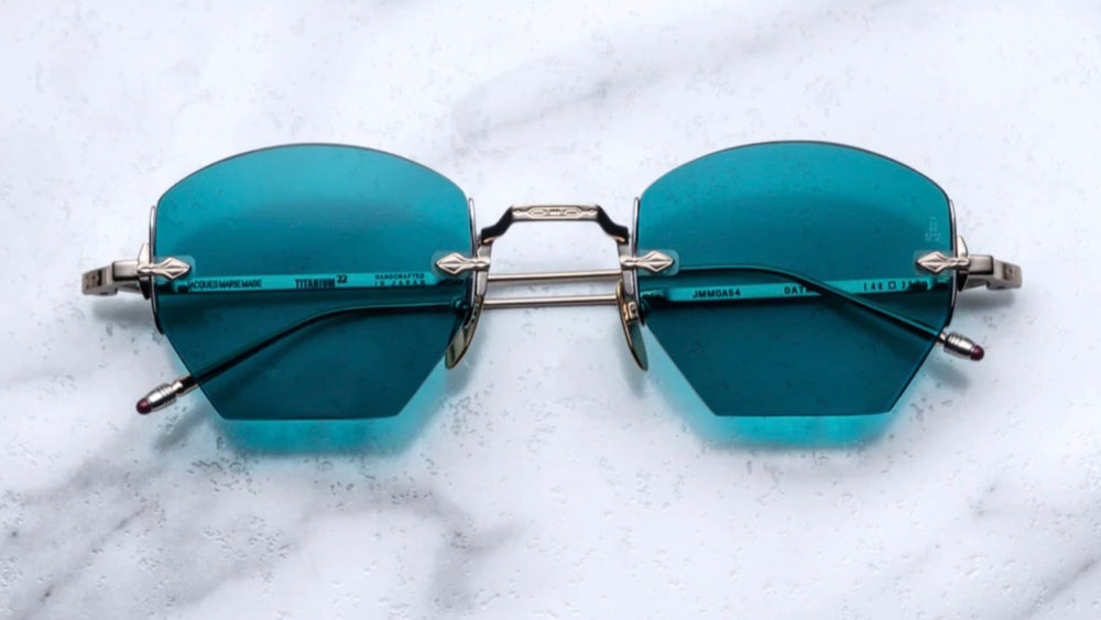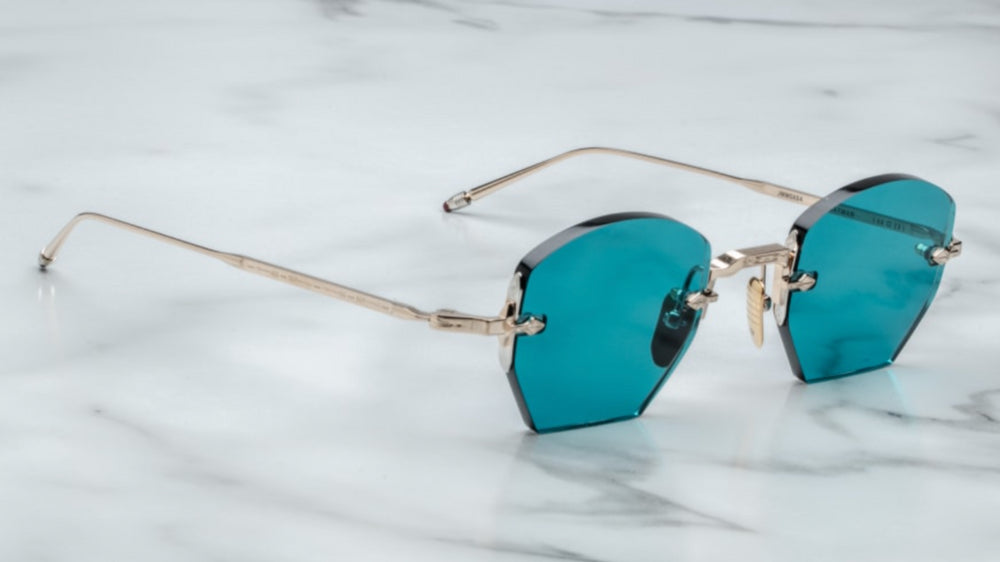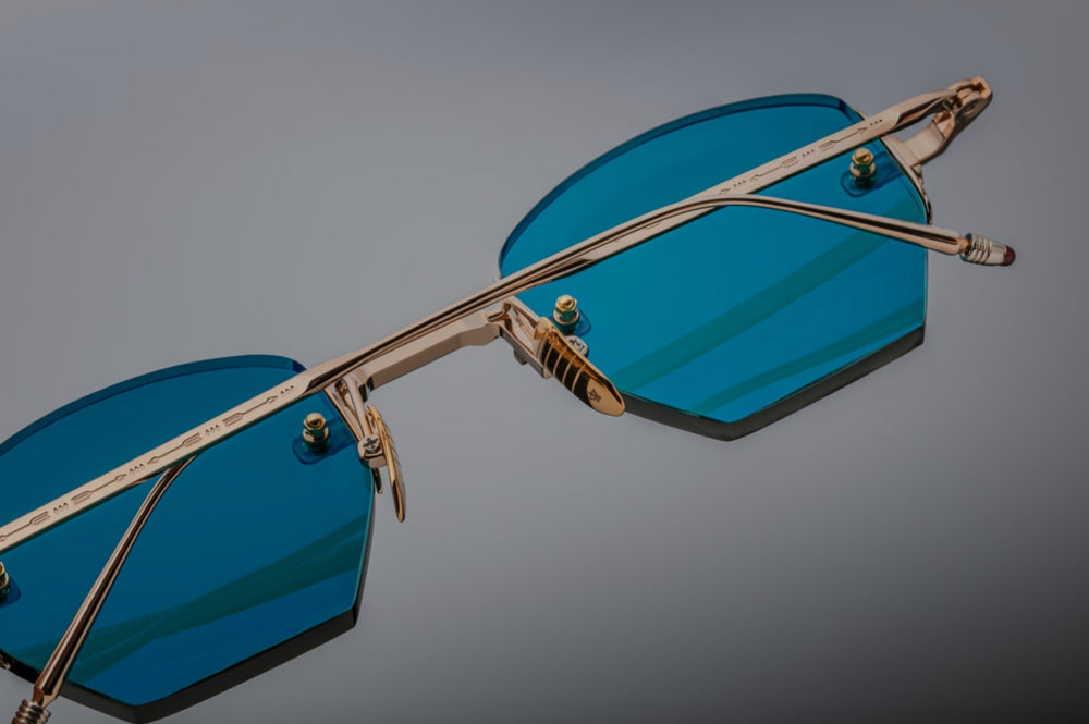 Luxurious rimless geometric sunglasses with an angular, avant-garde design. The lenses feature a striking turquoise-blue tint and are held by delicate silver metalwork with distinctive decorative details at the corners. The minimalist bridge and temple design creates an elegant, sophisticated appearance typical of high-end eyewear. The glasses showcase excellent craftsmanship with subtle branding and premium finishing touches.