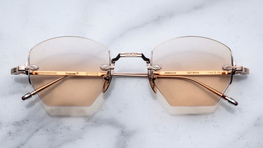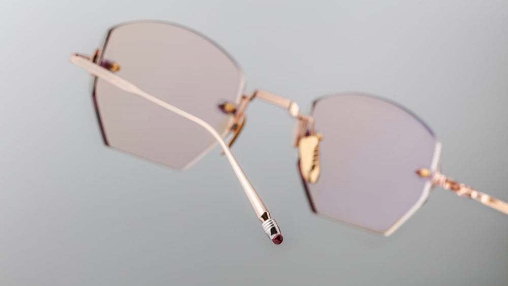 Luxurious titanium rimless geometric frames with delicate gold hardware and subtle brown-tinted lenses. The design features distinctive hexagonal lens shapes and elegant metal temple arms with decorative Art Deco-inspired detailing. The minimalist frameless construction is complemented by adjustable nose pads and slim temple tips, creating a sophisticated, vintage-inspired aesthetic that works equally well for formal or casual wear.