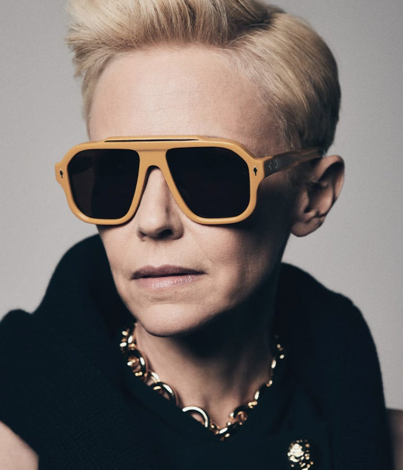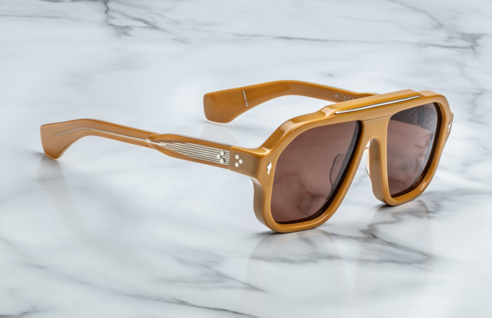 These luxurious Jacques Marie Mage sunglasses feature a bold retro-inspired aviator silhouette with a distinctive thick plastic frame in a warm caramel/orange tone. The design showcases a prominent brow bar and substantial temples, creating a confident, vintage-influenced aesthetic. The dark brown lenses complement the frame color perfectly, while the saddle bridge adds to its classic appeal. The sunglasses embody a sophisticated blend of vintage styling with contemporary luxury craftsmanship.