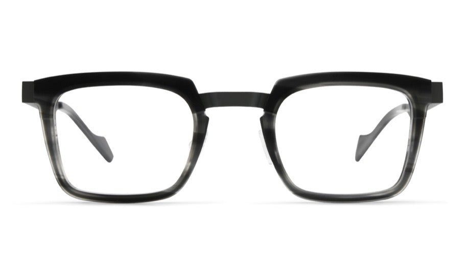 This is a bold geometric frame with a striking angular square-rectangular silhouette. The frame features a distinctive thick acetate construction that graduates from solid black to a subtle grey translucent effect at the bottom. The design offers a contemporary, architectural look with clean lines and sharp angles. The chunky temples complement the substantial front frame, creating a cohesive, modern aesthetic suitable for fashion-forward individuals.