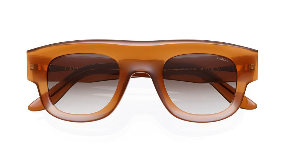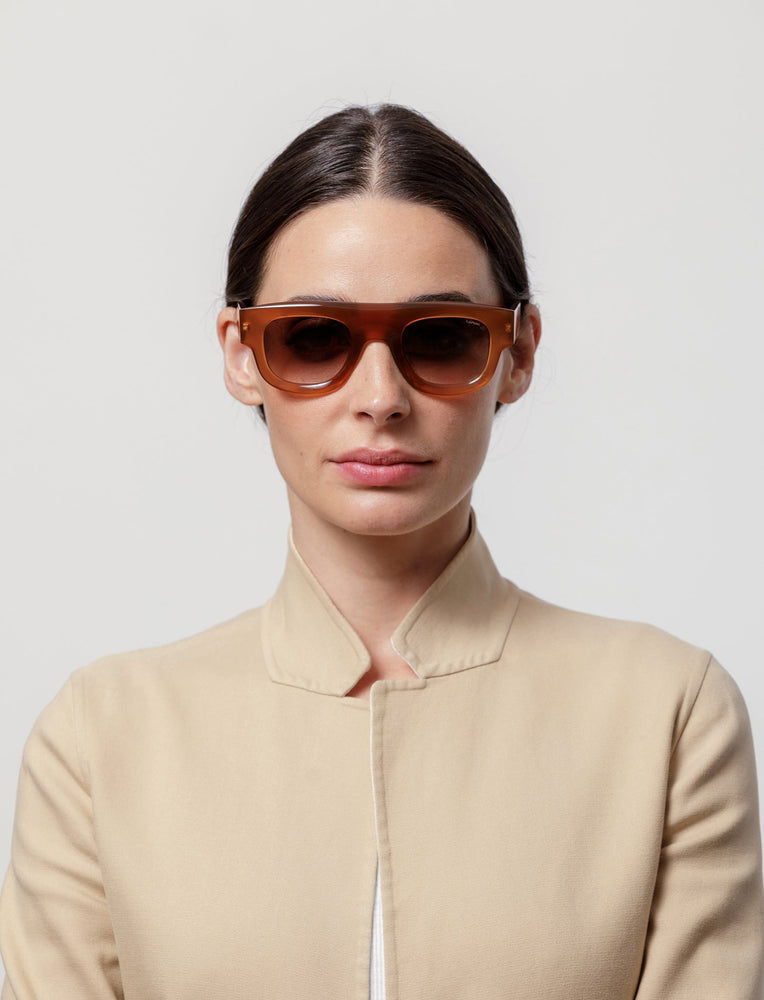 These bold oversized sunglasses feature a distinctive chunky acetate frame in a warm gradient honey-amber brown color. The frame has a flat-top design with softly rounded bottom edges, creating a modern yet retro aesthetic. The lenses show a subtle gradient tint from darker to lighter. The design exhibits premium craftsmanship with smooth finish and seamless construction, characteristic of luxury eyewear. The substantial temple arms match the front frames color and thickness, creating a cohesive high-end look.