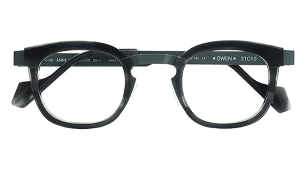 These OWEN frames by ANNE ET VALENTIN feature a distinctive geometric shape with a bold, architectural design. The frames have a sophisticated matte black finish with clean lines and a contemporary aesthetic. The design incorporates interesting angular elements while maintaining a wearable, versatile silhouette. The eyepieces are connected by a substantial bridge, creating a cohesive look that would suit modern, design-conscious wearers.
