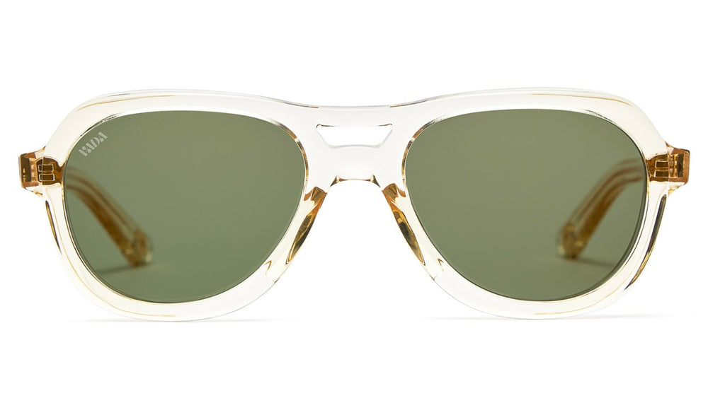 Elegant transparent/clear acetate aviator-style sunglasses with a modern twist. Features green-tinted lenses and gold-toned temple accents. The frame has a sophisticated translucent finish with a substantial build quality. The design combines vintage aviator aesthetics with contemporary materials, creating a versatile and stylish look suitable for both casual and formal wear. The saddle bridge provides comfortable weight distribution, while the gold temple details add a premium touch to the overall design.